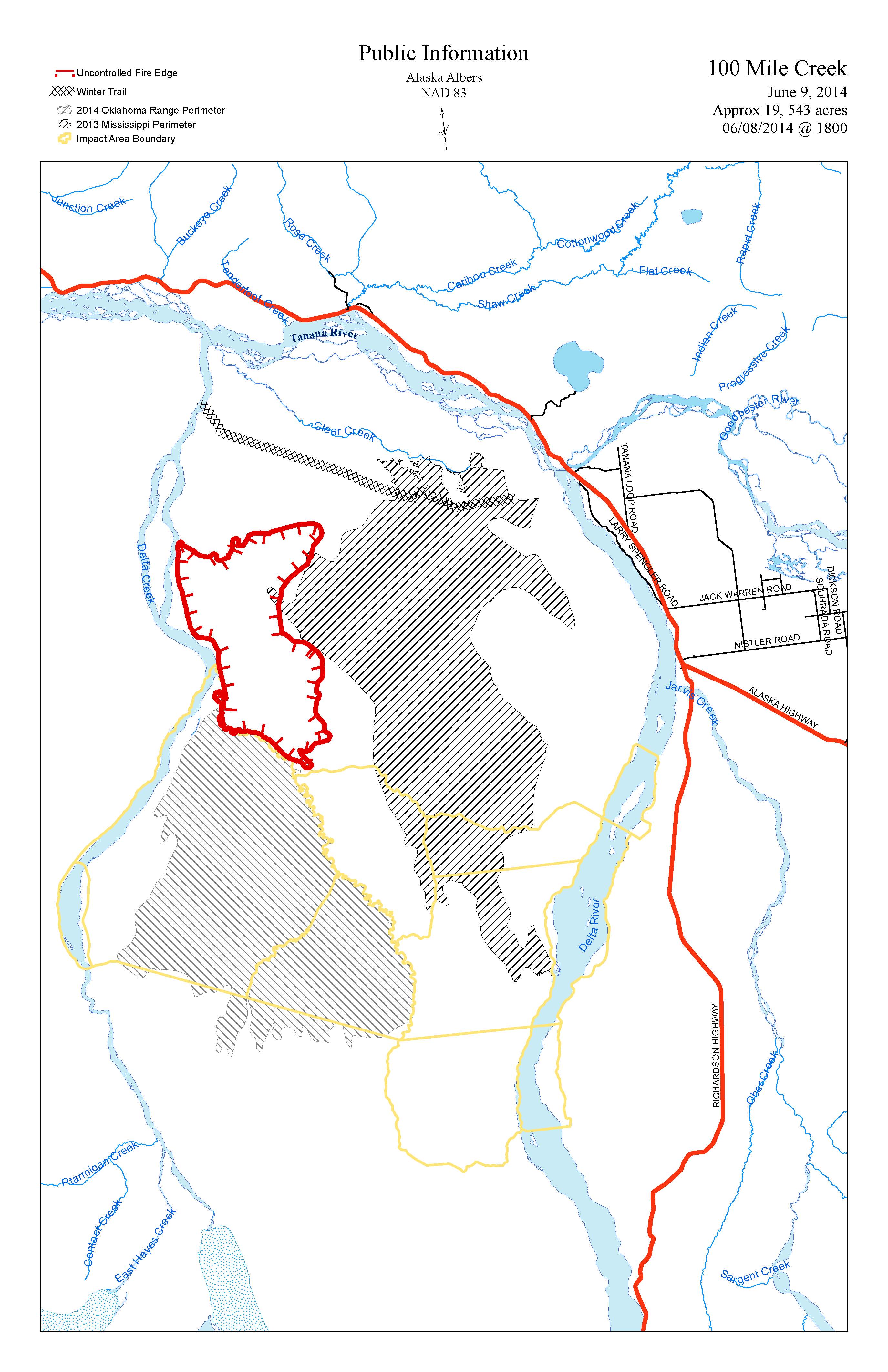 100 Mile Creek Fire Perimeter Map By AK_PIO_Saarloos on June 9, 2014 Current fire perimeter for the 100 mile creek fire – Monday June 9, 2014 Like Loading...‹ Lightning fire starts in TananaKindanina Lake Fire contained ›Categories: Active Wildland Fire, AK Fire Info
