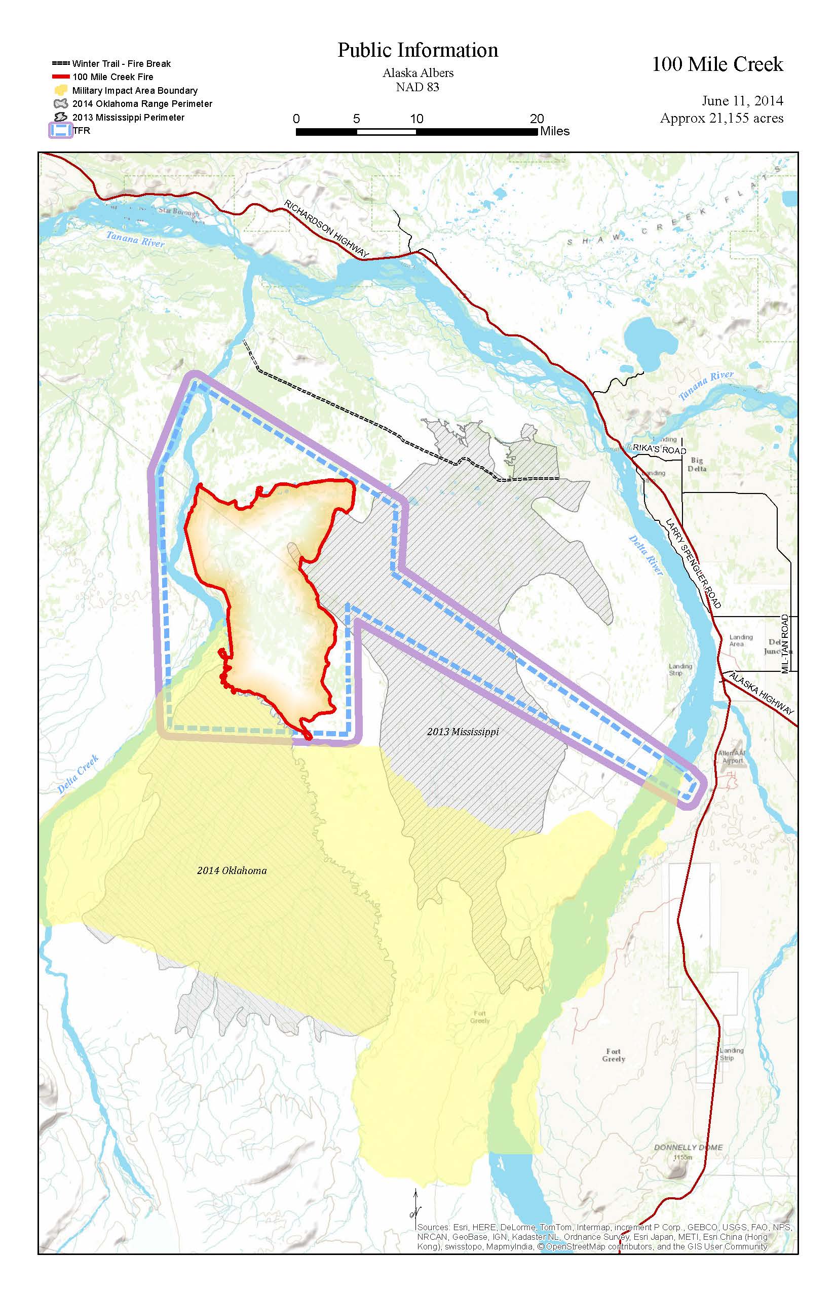 The 100 Mile Creek Fire is located 20 miles southwest of Big Delta, Alaska. The area of the fire is currently estimated at 21,155 acres with 5% of the perimeter contained.