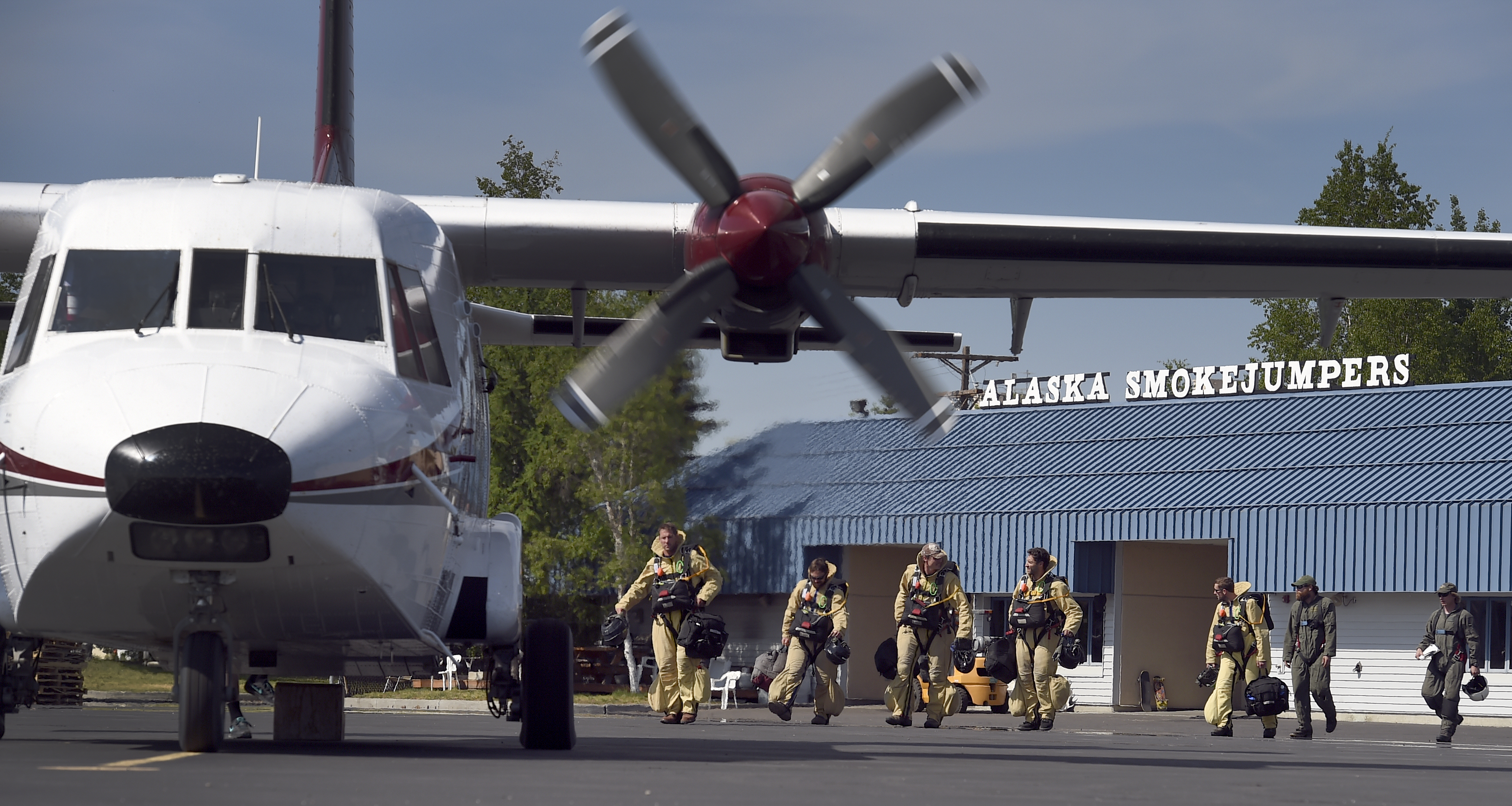 Smokejumpers from BLM Boise, Idaho, board a CASA-212 to make their practice jump Saturday afternoon, May 23, 2015, at the BLM Alaska Smokejumpers Base on Ladd Air Field at Fort Wainwright. Because of high fire danger in Alaska, 16 additional smokejumpers were brought to the state. Once the crews from Boise have completed their orientation to Alaska they will enter into the fire assignment rotation. Red Flag Warnings are forecasted to remain in effect for the Interior of Alaska through the Memorial Holiday weekend. Sam Harrel BLM-AFS photo