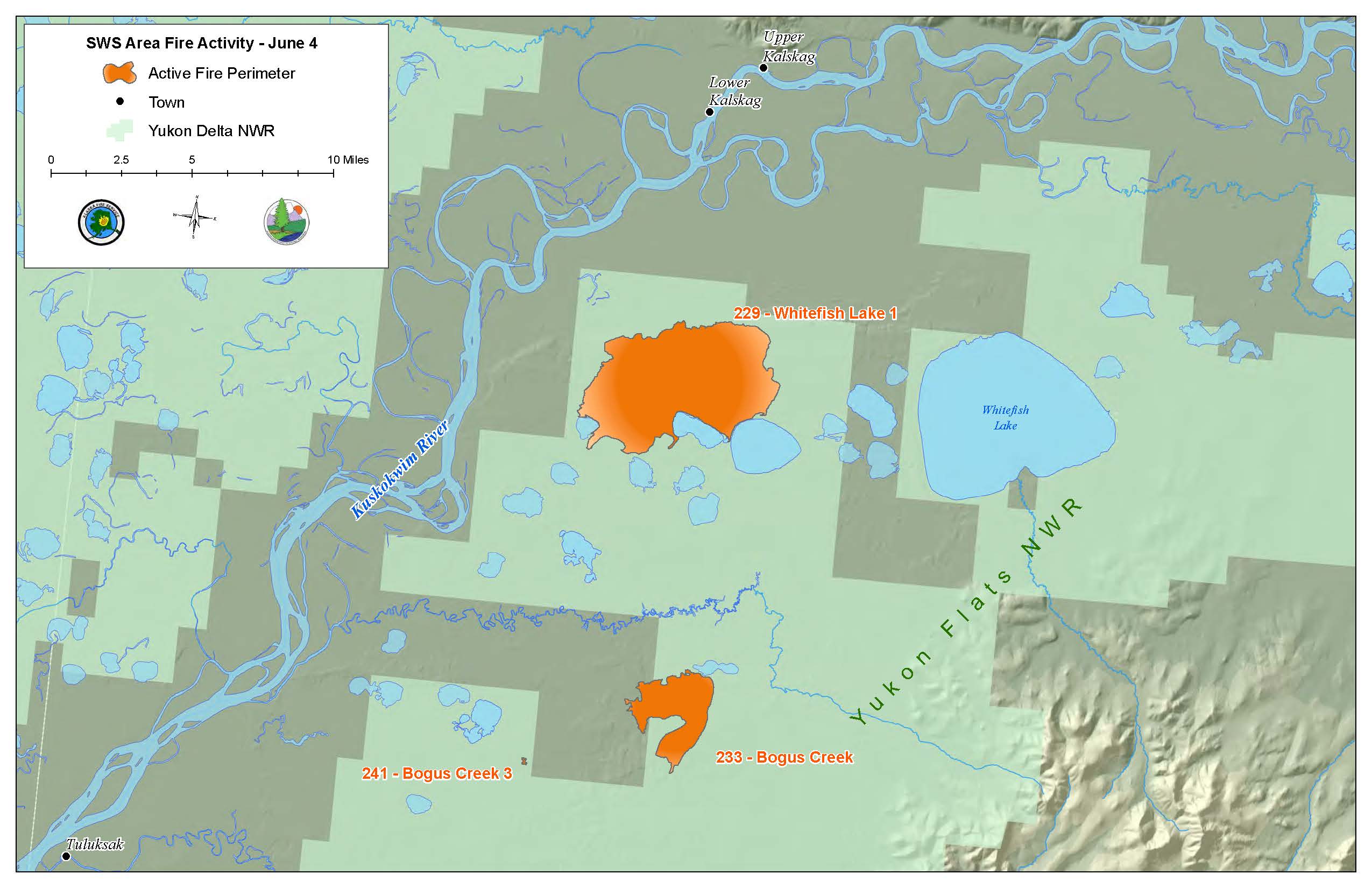 Another large, lightning-caused fire is burning in southwest Alaska. The 8,268-acre Bogus Creek Fire is also in the Yukon Delta National Wildlife Refuge just south of the Whitefish Lake Fire 1. Water scooping aircraft may be used to direct the fire into natural barriers to contain it.