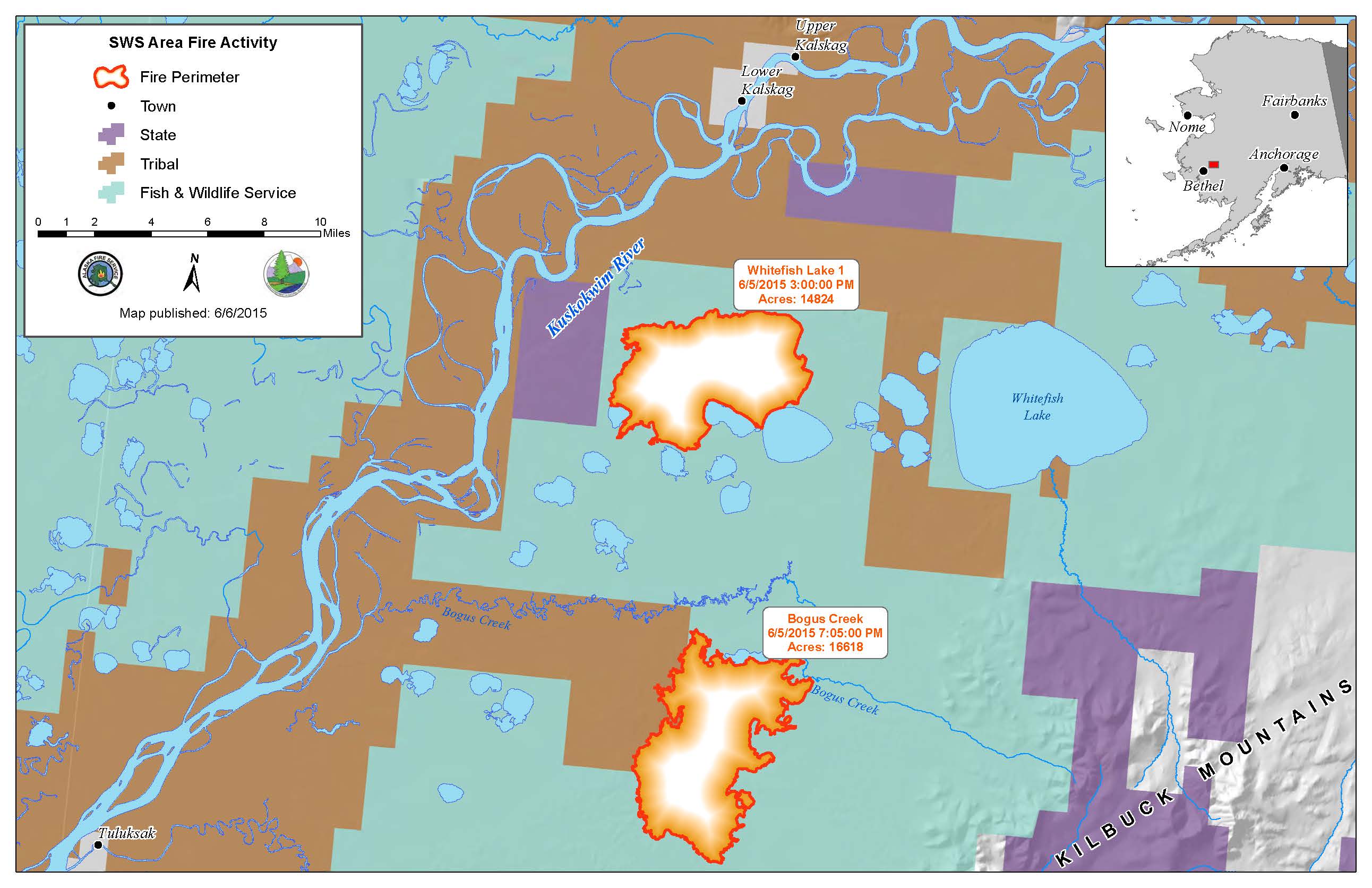 Both fires were started by lightning on May 31st and are burning primarily in the Yukon Delta National Wildlife Refuge. Firefighters have been battling the Whitefish Lake 1 Fire for the past week and have secured the perimeter of the fire. The Bogus Creek Fire has been burning unchecked since it started because it did not pose a threat but fire managers now want to check its spread.