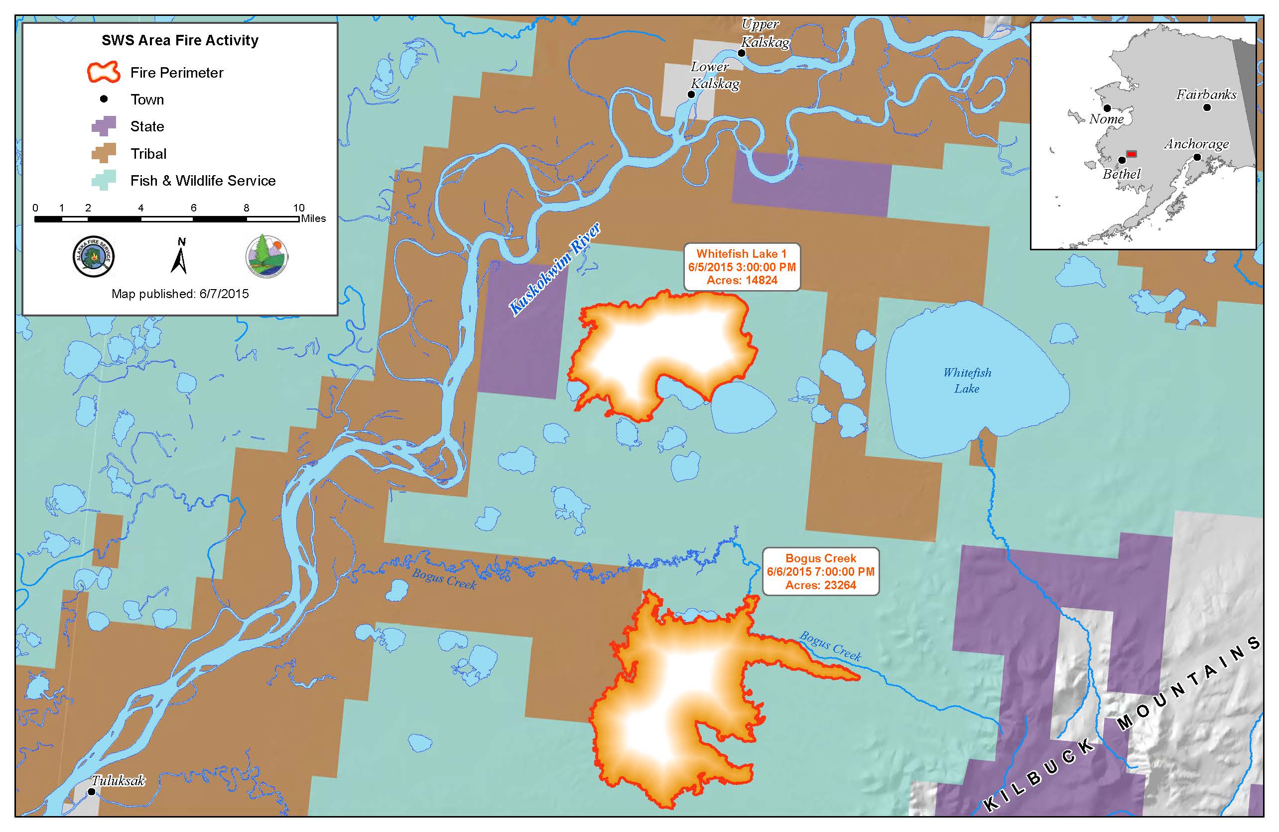 Both fires were started by lightning on May 31st and are burning primarily in the Yukon Delta National Wildlife Refuge. The Bogus Creek Fire is described as a very large, wind-driven grass fire burning in open tundra. It is not threatening any Native allotments or structures at this time.