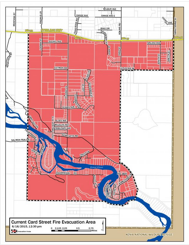 6:00 p.m. – The second evacuation of the day is underway in the Kenai Keyes subdivision on the Kenai Peninsula due to the Card Street Fire, which is now estimated at 2,000 acres.