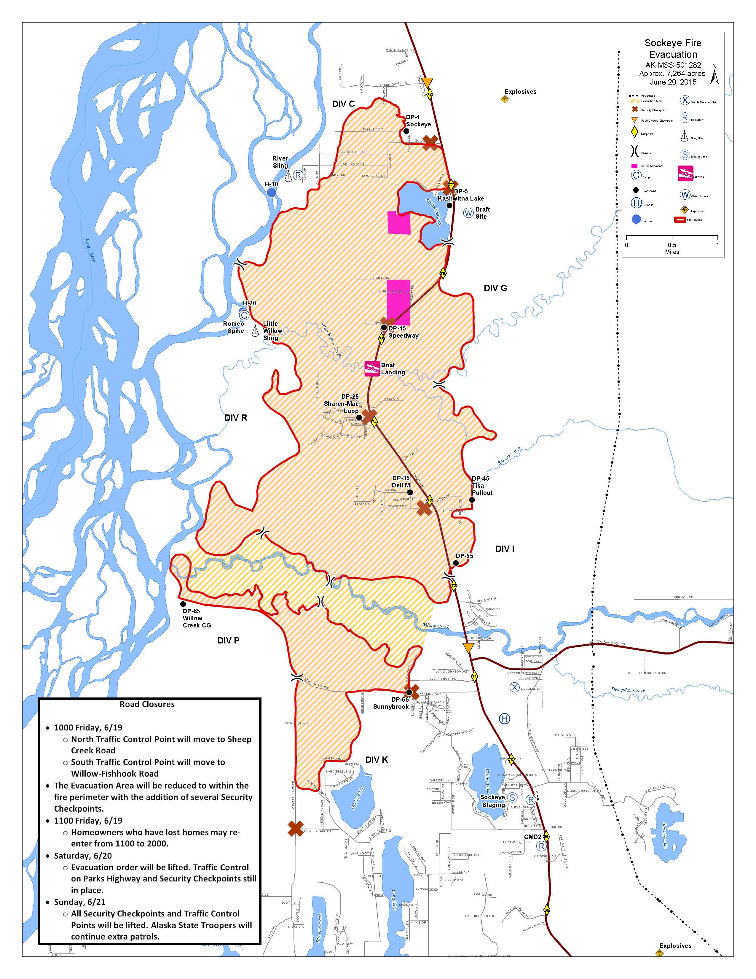 Fire lines held yesterday against the south winds, and the remaining evacuations were lifted today as planned. The south winds have brought cooler temperatures and higher humidity, which are helping firefighters. The small increase in acreage occurred on the southwest side of the fire, near Willow Creek and the Sustina River, where isolated pockets of black spruce continue to burn but are not threatening structures. Firefighters have completed some sections of fire lines along the north, east and south flanks of the fire and will continue building lines around the remaining fire perimeter. While firefighters are making excellent progress suppressing the fire and establishing lines, they are ensuring those lines are secure before considering them in the contained. Closures Willow Creek is closed to all rafting, boating, fishing and other water activities from mile post 72.5 of the Parks Highway to Willow Creek Campground and Day Use Area. The campground and day use area are also closed. Flight restrictions Pilots are reminded that Temporary Flight Restrictions remain in place for the Sockeye Fire area because of the continued potential for aircraft activity related to fire suppression. On Friday the flight restriction was reduced to permit general aviation traffic into Long Lake, Willow Lake and the Willow Airport. For specific information about Temporary Flight Restrictions, visit http://tfr.faa.gov/tfr2/list.jsp. Evacuation lifted, checkpoints remain in place Firefighters and Borough officials lifted the remaining evacuation order today. Only residents will be allowed through the security checkpoints, which will remain in place until Monday, June 22. Firefighters are asking residents and the public to be mindful of the fire traffic and firefighters working in the area. Please drive slowly and with your lights on, and use extreme caution when traveling in this area. Traffic control points continue Traffic control points on the Parks Highway will continue between Willow/Fishhook Road (MP 71) and Sheep Creek Road (MP 78) through the weekend and are expected to be lifted Monday, June 22. Travelers should anticipate delays in this area. |
