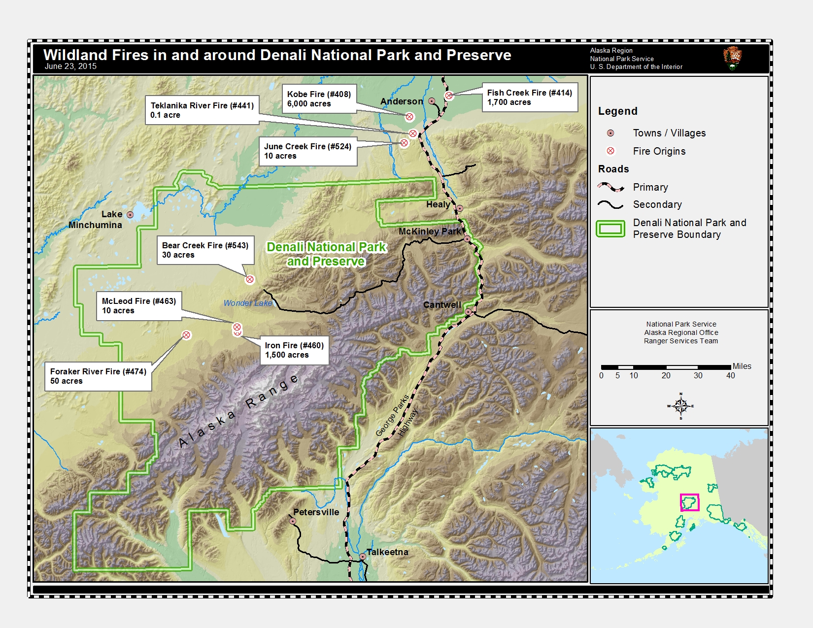 The largest and most active wildfire in Denali National Park is the 1,500 acre Iron Wildfire. Spotted from a Kantishna Air Taxi pilot on the evening of June 20. Under the very hot and dry conditions, extreme fire behavior was observed with aggressive crown runs. Smoke may be visible from Turtle Hills.