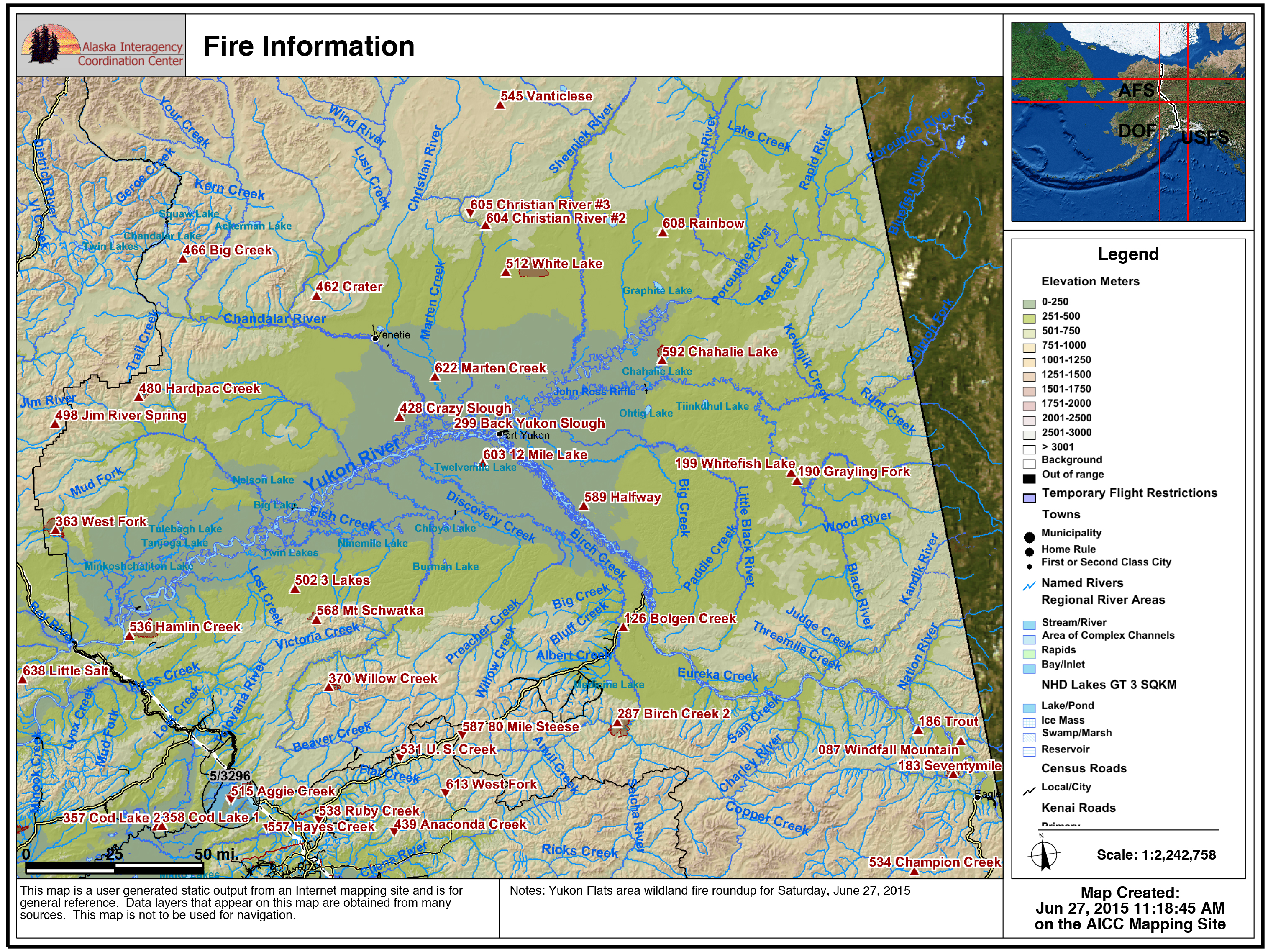 Sunday: Fire personnel on N9011N reported Friday a 15-acre fire running and group tree torching in white spruce/tundra. Fire plots in Limited and has been placed in monitor status.