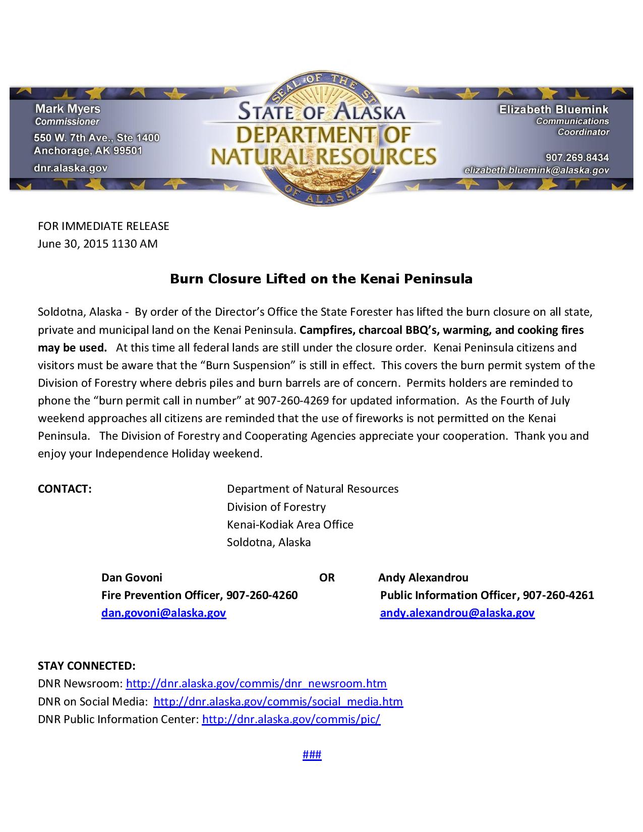 Soldotna, Alaska – By order of the Director’s Office the State Forester has lifted the burn closure on all state, private and municipal land on the Kenai Peninsula. Campfires, charcoal BBQ’s, warming, and cooking fires may be used. At this time all federal lands are still under the closure order. Kenai Peninsula citizens and visitors must be aware that the “Burn Suspension” is still in effect. This covers the burn permit system of the Division of Forestry where debris piles and burn barrels are of concern. Permits holders are reminded to phone the “burn permit call in number” at 907-260-4269 for updated information. As the Fourth of July weekend approaches all citizens are reminded that the use of fireworks is not permitted on the Kenai Peninsula. The Division of Forestry and Cooperating Agencies appreciate your cooperation. Thank you and enjoy your Independence Holiday weekend.