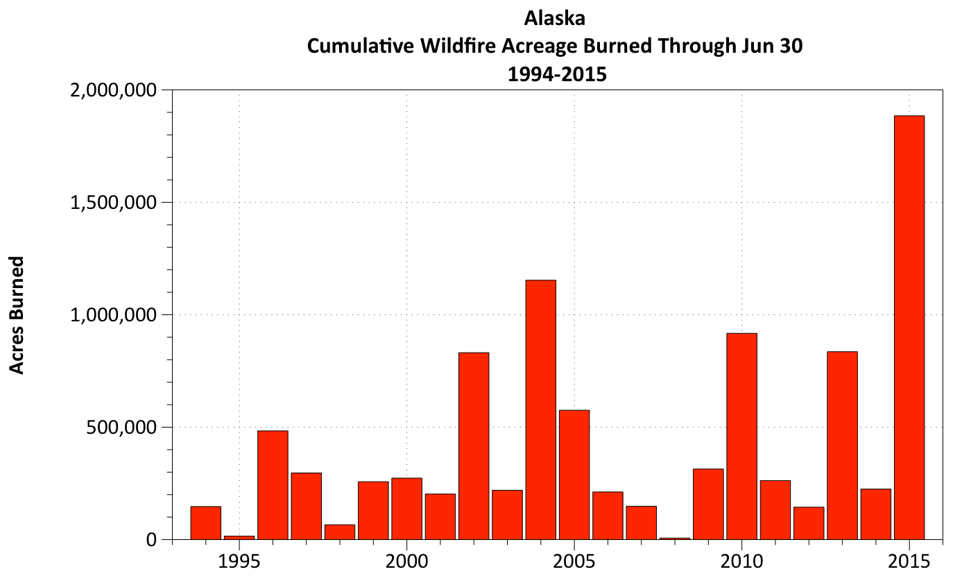 While the amount of acreage burned in Alaska during June of 2015 shattered the previous acreage record set in June of 2004 by more than 700,000 acres, it remains to be seen if this summer’s wildfire season will keep pace with or challenge the summer of 2004 in terms of total acreage burned.