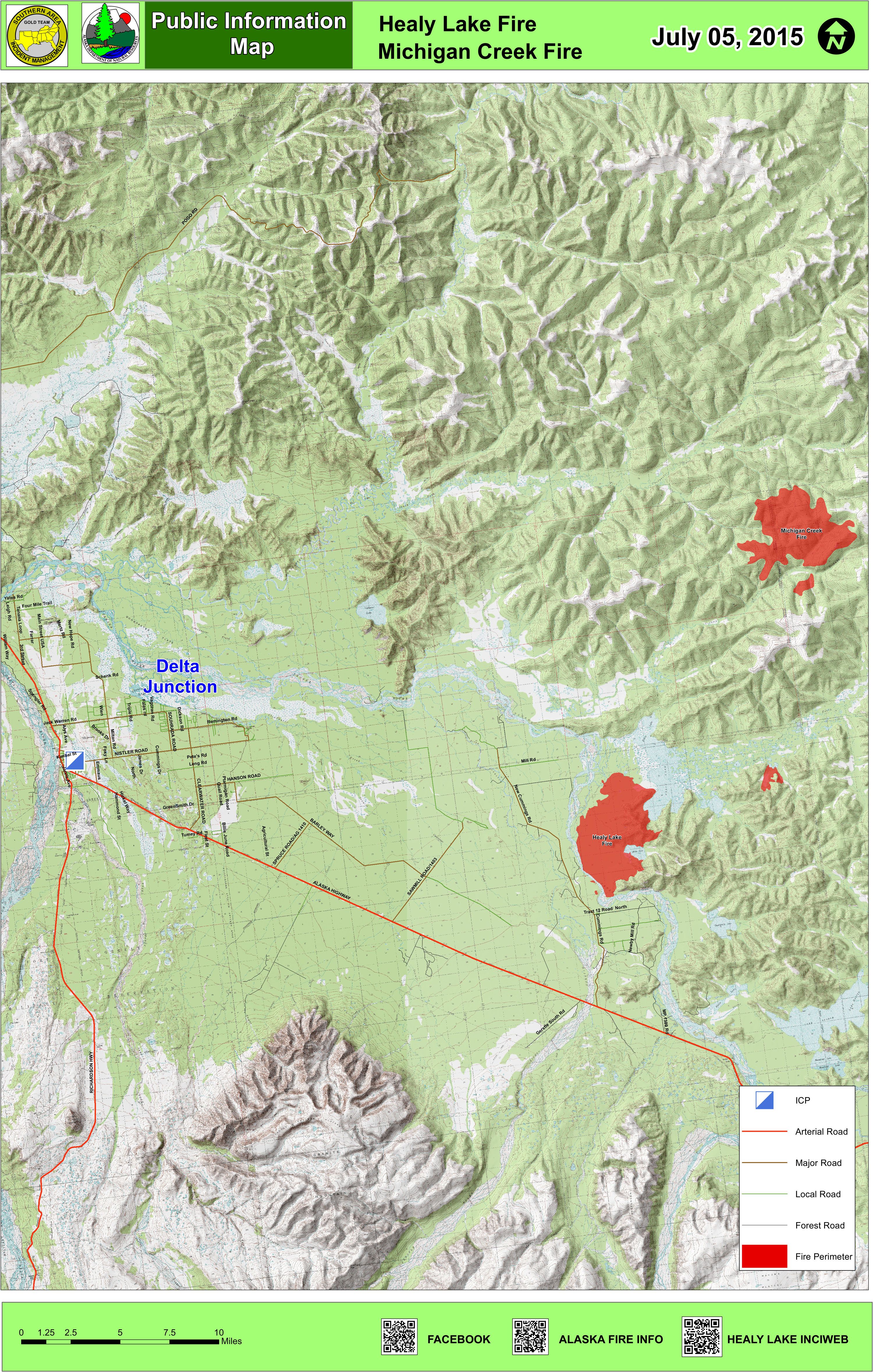 The Healy Lake Fire started on June 16, 2015 approximately 28 miles southeast of Delta Junction, Alaska. The cause was lightning. The acreage total is holding at 10,331. The fire is reported as 63% contained. Safety concerns have been created by rising river levels and increased risk of trees falling because of the recent rain and wind.