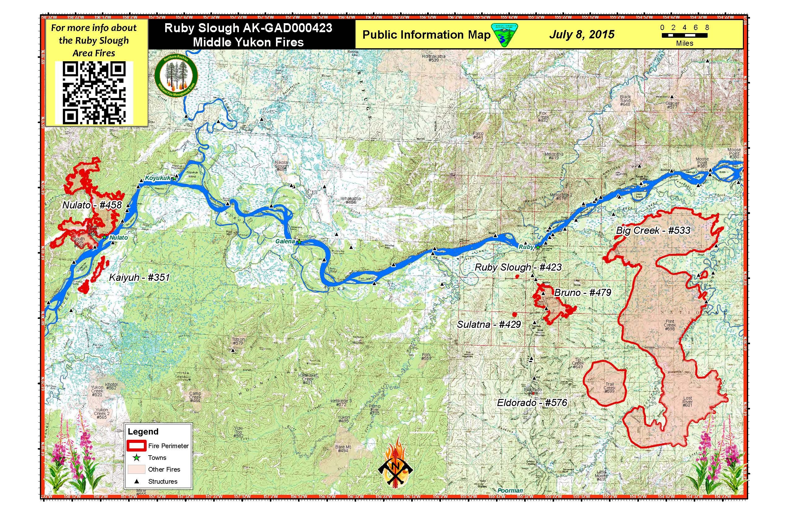Fire Names: The following fires are now being reported in the daily Incident Status Summary (ICS-209) as “Middle Yukon Fires”: Nulato #458 (39548 acres), Ruby Slough #423 (49 acres), Bruno Creek #479 (13480 acres), and Big Creek Two #533 (283760 acres). The Eldorado #576, Kaiyuh #351, and Sulatna #429 fires are in a monitoring status.