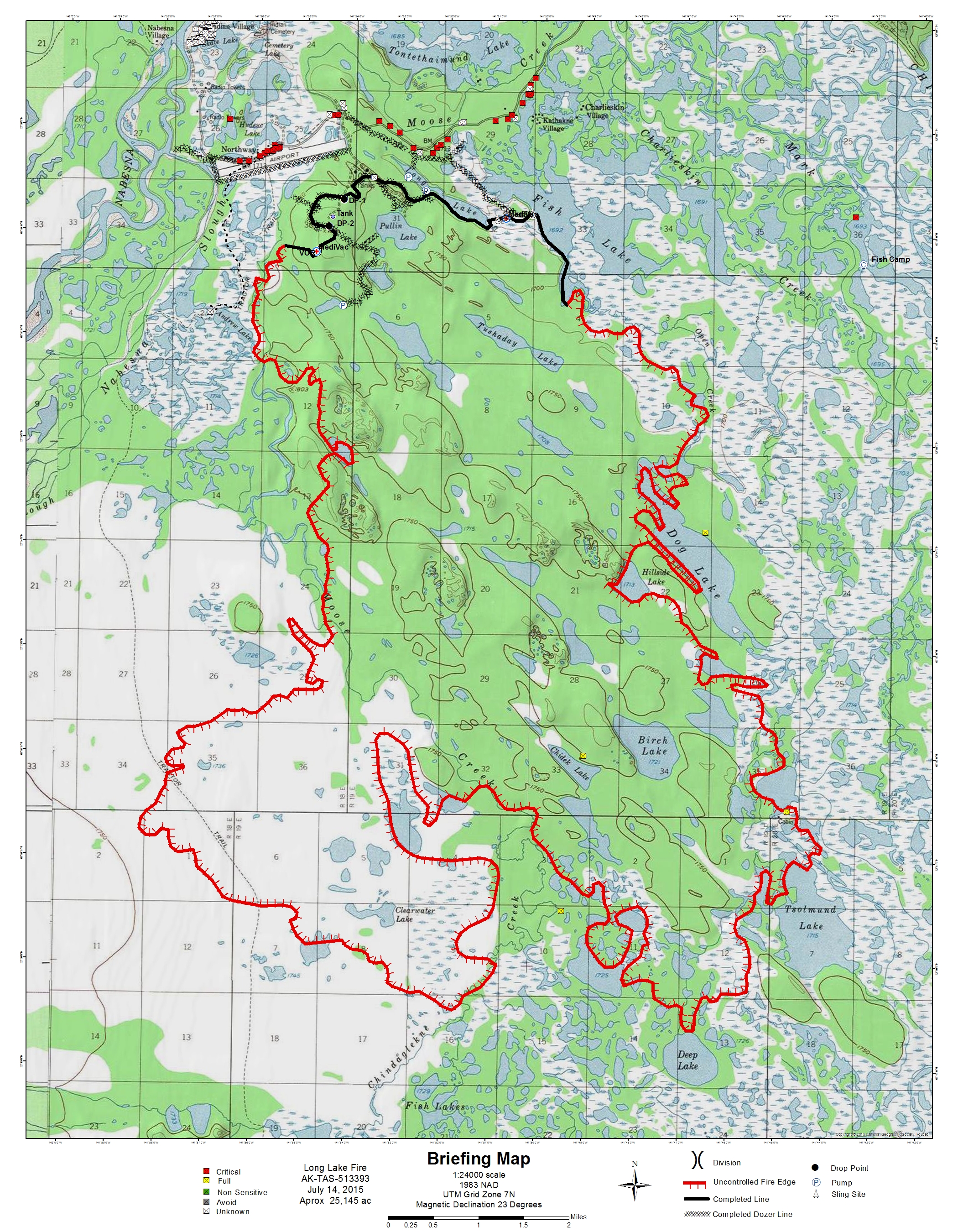 Long Lake Fire –– Progress continues despite the rough terrain on the western perimeter as crews construct line to Andrew Lake. Containment of the northern perimeter remains a priority to keep fire south of the Northway airport. Moderate fire behavior is expected again today which will help firefighters secure structure protection efforts on the remote cabins on the east side of the fire. Strategic helispots are being constructed to optimize operational tactics. Incident Command Post (ICP) is located at the school in Northway, Alaska. Currently 167 firefighters are working on the Long Lake Fire.