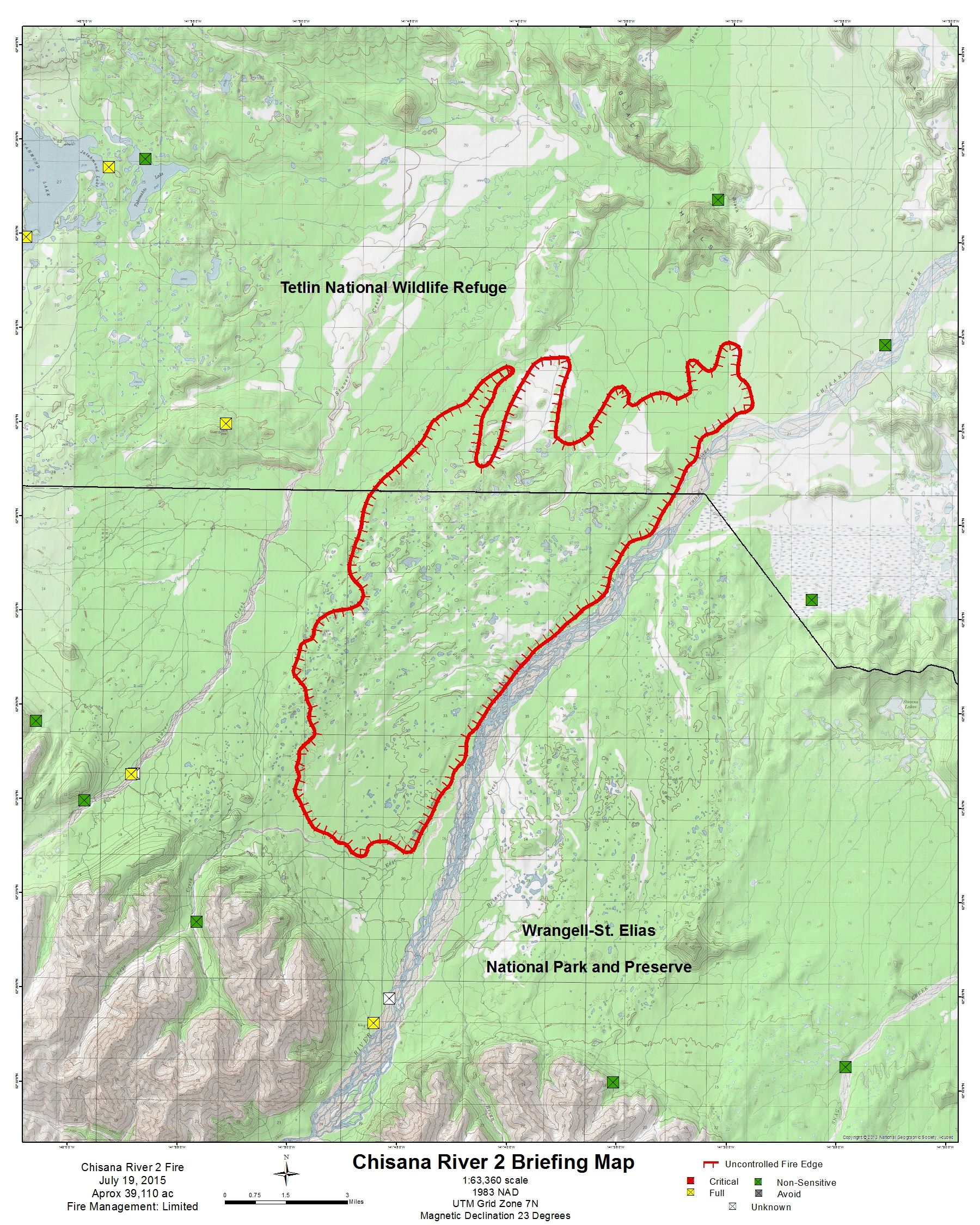 Chisana 2 Fire –– Fire activity increase due to interior pockets of unburned trees burning yesterday. Smoke will continue to be visible from the Alaska Highway. The Chisana 2 Fire is approximately 38,385 acres. The fire will continue to be unstaffed and in monitoring status.