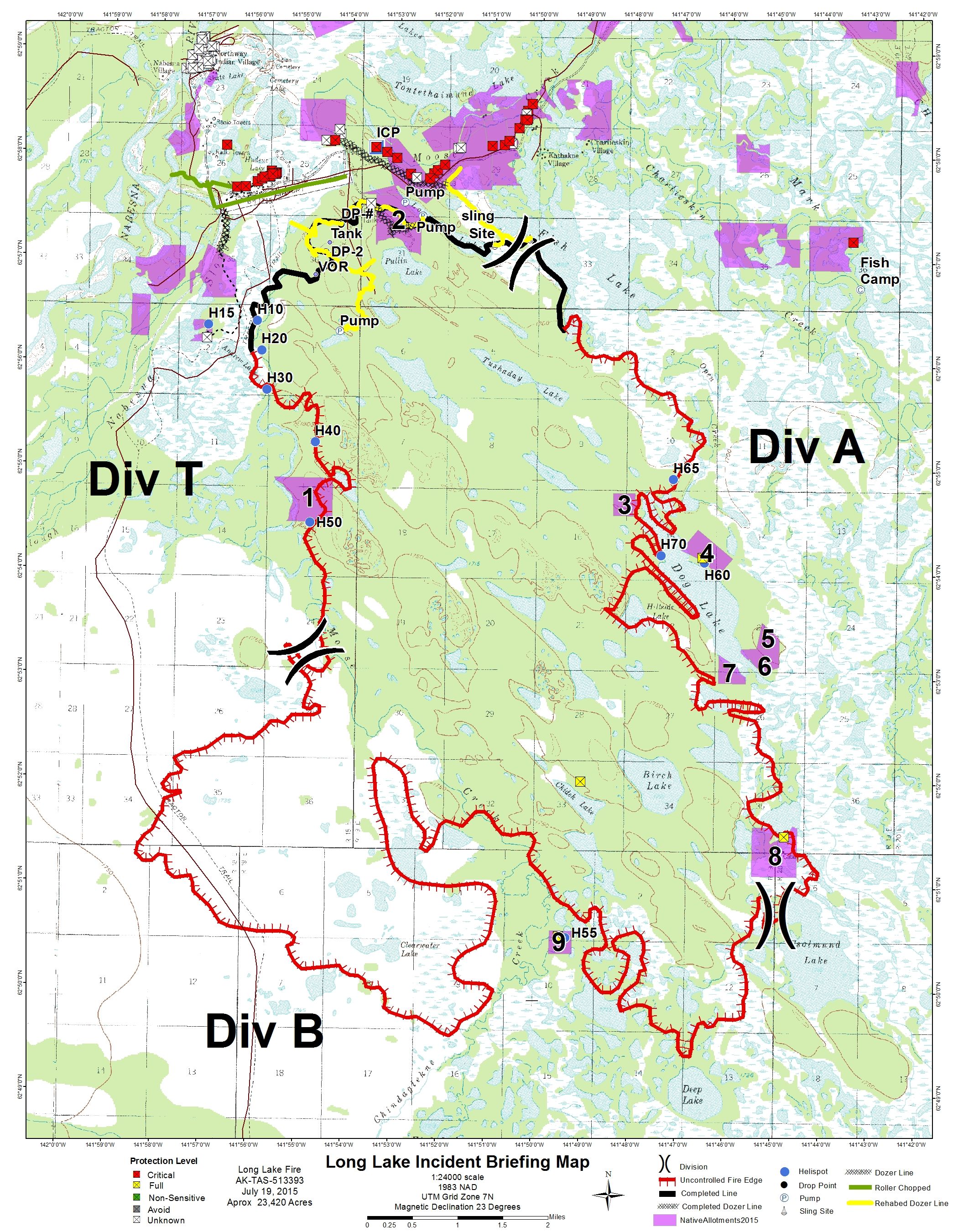 Long Lake Fire –– Containment percentage increased to 27 percent on northern perimeter, keeping fire from spreading north to the village of Northway. A strategic spike camp is being constructed, optimizing operational resources to secure structure protection efforts on the remote cabins on the east side of the fire. Firefighters continue to build line utilizing natural boundaries, lakes and ponds. The fire is currently 23,430 acres and is staffed with 147 fire personnel.