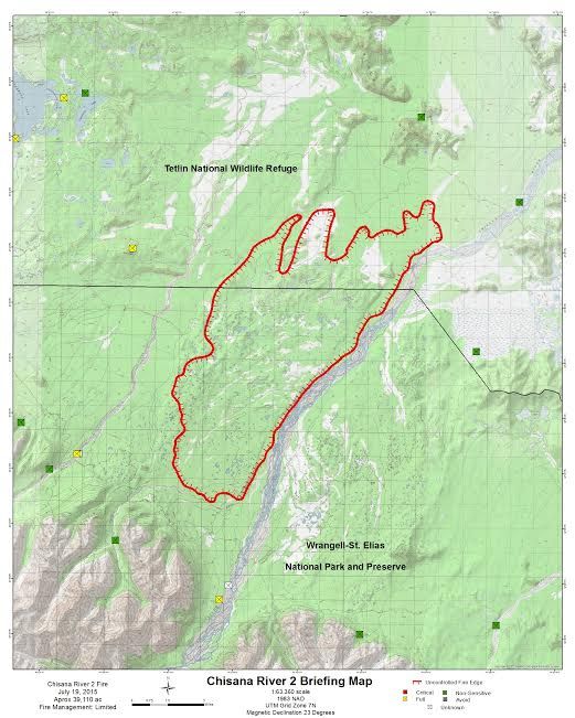 Chisana 2 Fire –– (38,385 acres) Fire activity increase due to interior pockets of unburned trees burning yesterday. Smoke will continue to be visible from the Alaska Highway. The fire will continue to be monitored by aircraft.