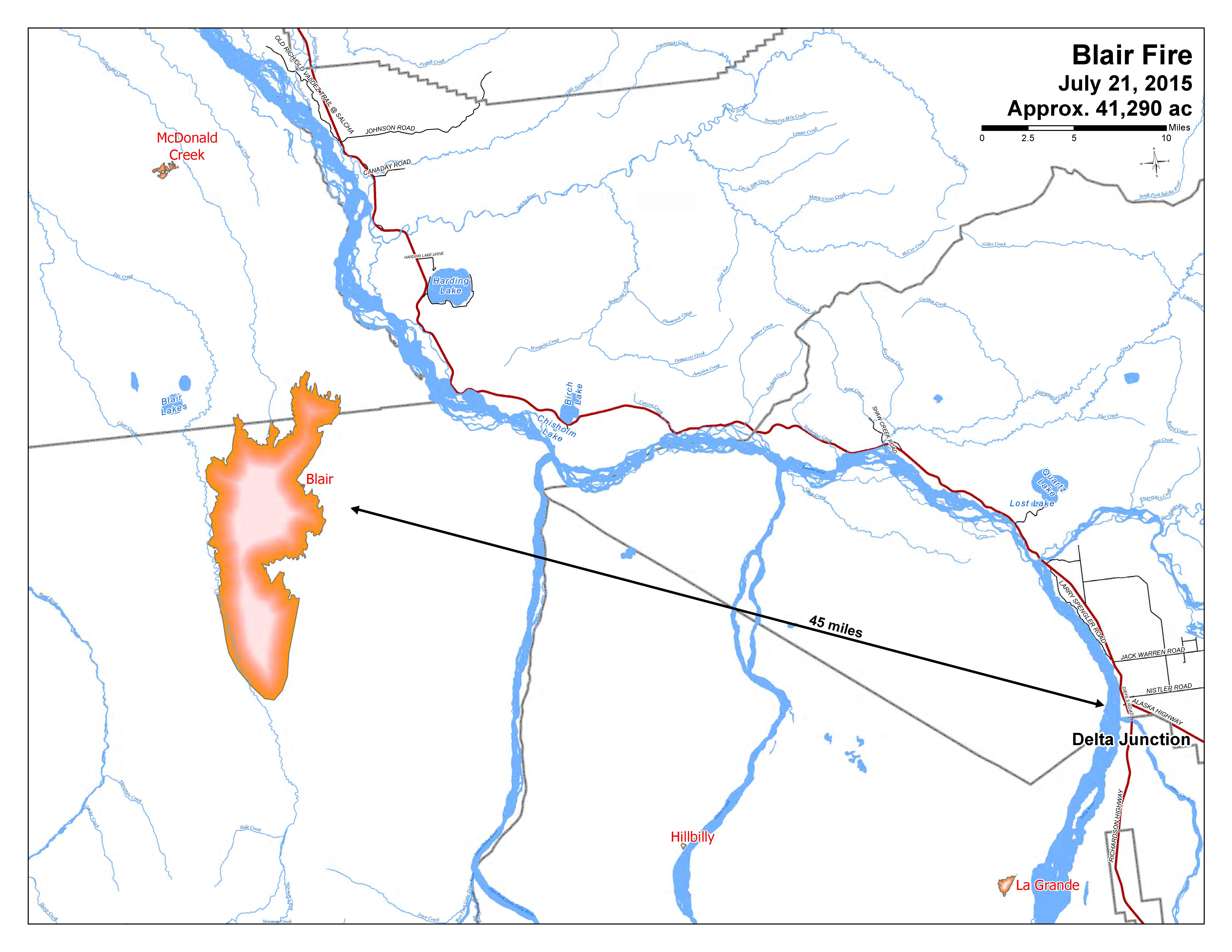 Blair, AFS: The lightning-caused Blair Fire is 41,290 acres. The last significant growth was seen Monday, July 13, when the fire exhibited active and extreme fire behavior. Wetting rains and cooler temperatures drastically slowed the fire activity over the last week. The return of warm and dry weather is expected to increase the fire behavior. On July 20 fire officials observed creeping, smoldering, and single tree torching on the north and northeast perimeters. The structures located at the 5-mile Clear Creek community, approximately 3 miles away, have complete structure protection in place. The precautionary assessment of structures in the Salcha and Harding Lake areas has been completed and the data is being used to update Forestry’s known structure database. The Unaweep Wildland Fire Module remains in place to provide structure protection along with improving and mapping secondary access to structures located along the ATV trails. Fire officials will continue aerial monitoring of the fire perimeter. Fire activity and smoke may be visible at times from the Alaska and Richardson highways from east of Delta to Fairbanks.