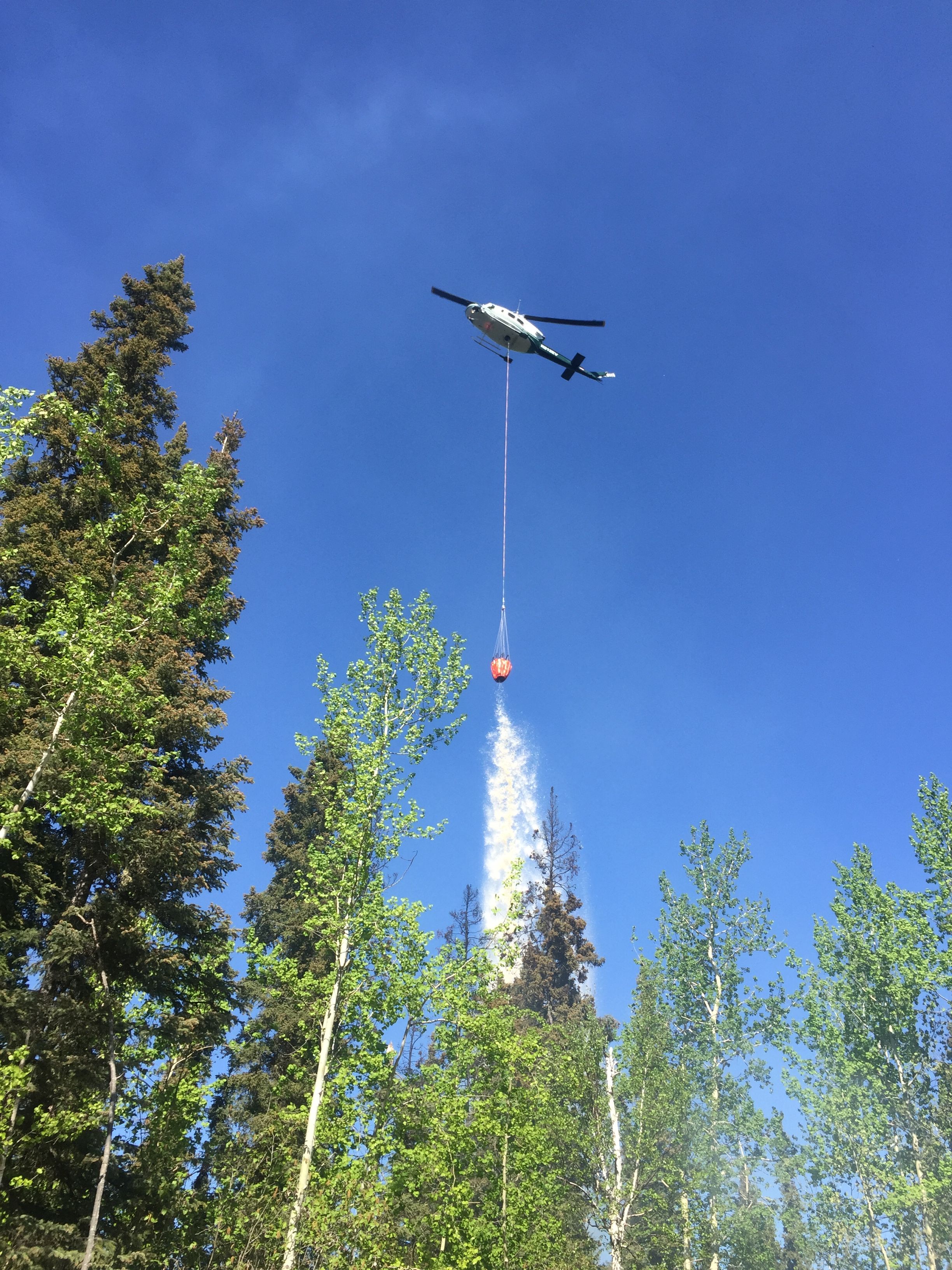 The first fire, the Ohio Creek Fire, was reported at about 2:45 p.m. off Standard Creek Road about 20 miles southwest of Fairbanks. Alaska Division of Forestry firefighters in the air and on the ground responded quickly to bring it under control. A helitack squad flew to the scene but could not land due to soggy conditions. Firefighters were able to hike in from the road, however, and put saw line and hose around the fire while the helicopter dropped several 300-gallon buckets of water on the fire from the air (photo by Tasha Shields). The fire was estimated at less than one-half acre and was called contained/controlled at approximately 6:30 p.m. The White Mountain Type 2 Initial Attack Crew from Fairbanks was scheduled to spend the night monitoring the fire and searching for hot spots. It was a great catch by Fairbanks Area staff. Good job.