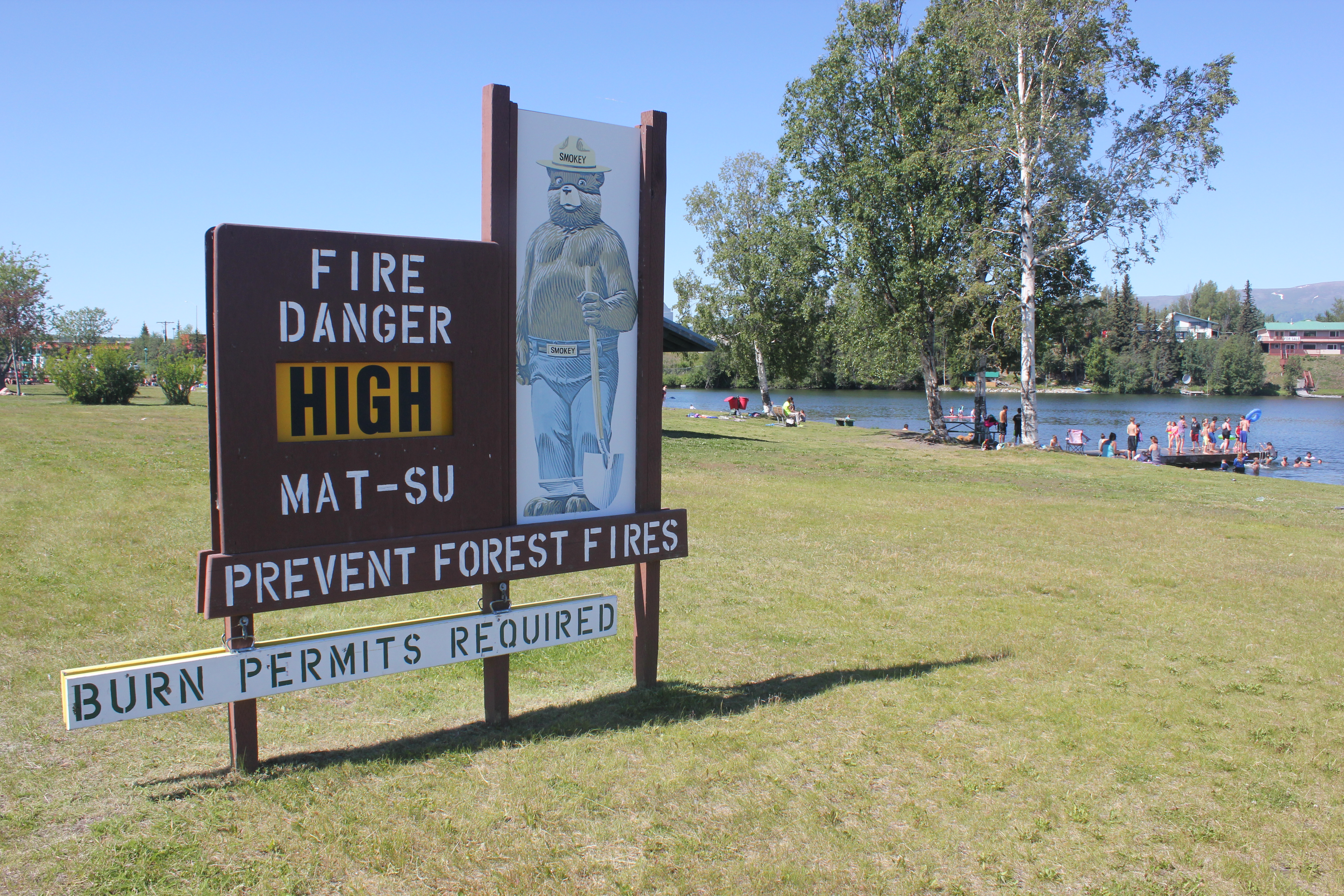 A Smokey Bear fire prevention sign on the beach at Lake Lucille in Wasilla on Wednesday sums up the current fire danger situation in much of the state. Photo by Tim Mowry/Alaska Division of Forestry