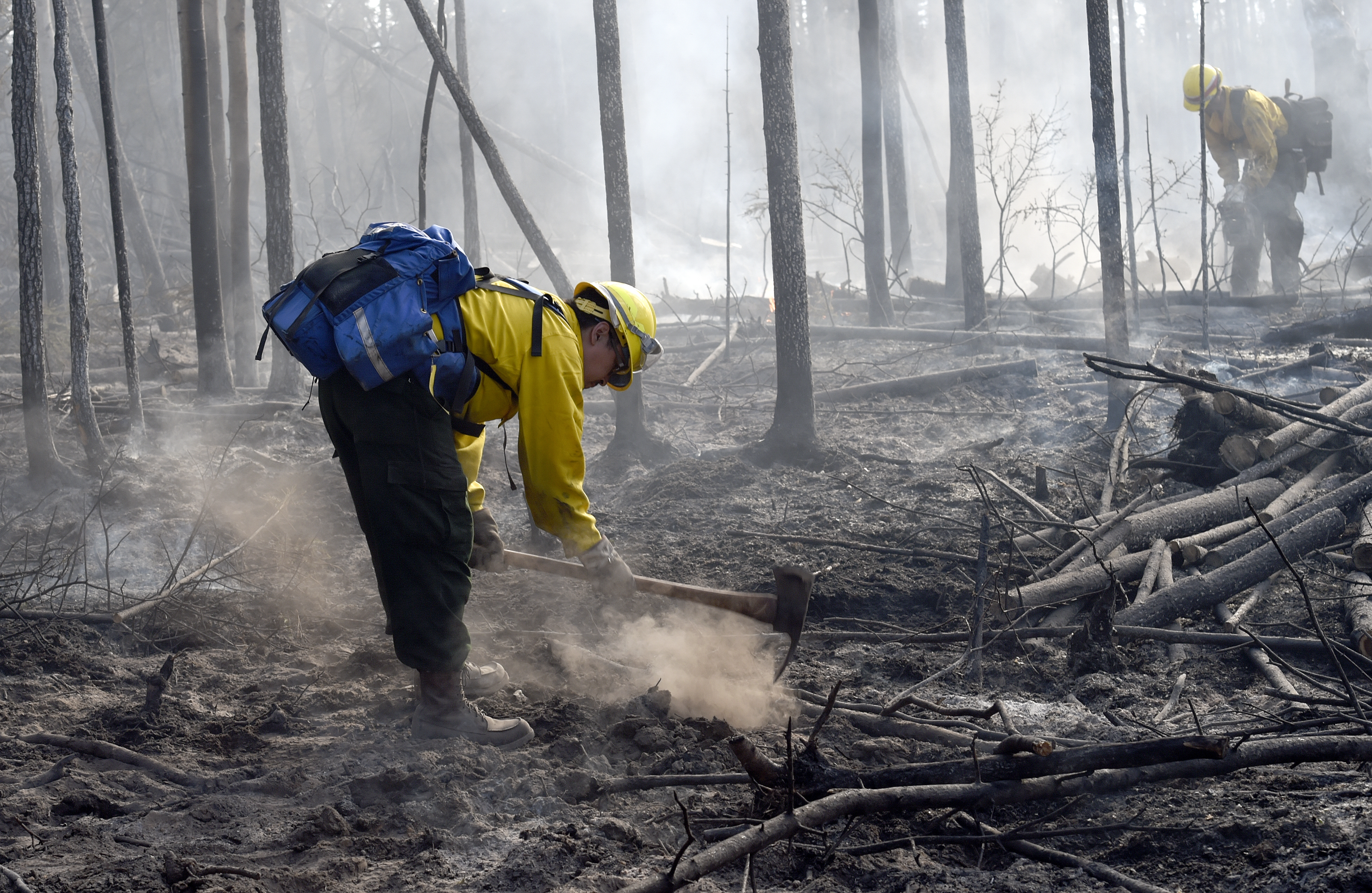 Members of the Fairbanks #1 crew mop up along the perimeter of the Tetlin River Fire on Monday, June 20, 2016. Photo by Sam Harrel/Alaska Division of Forestry