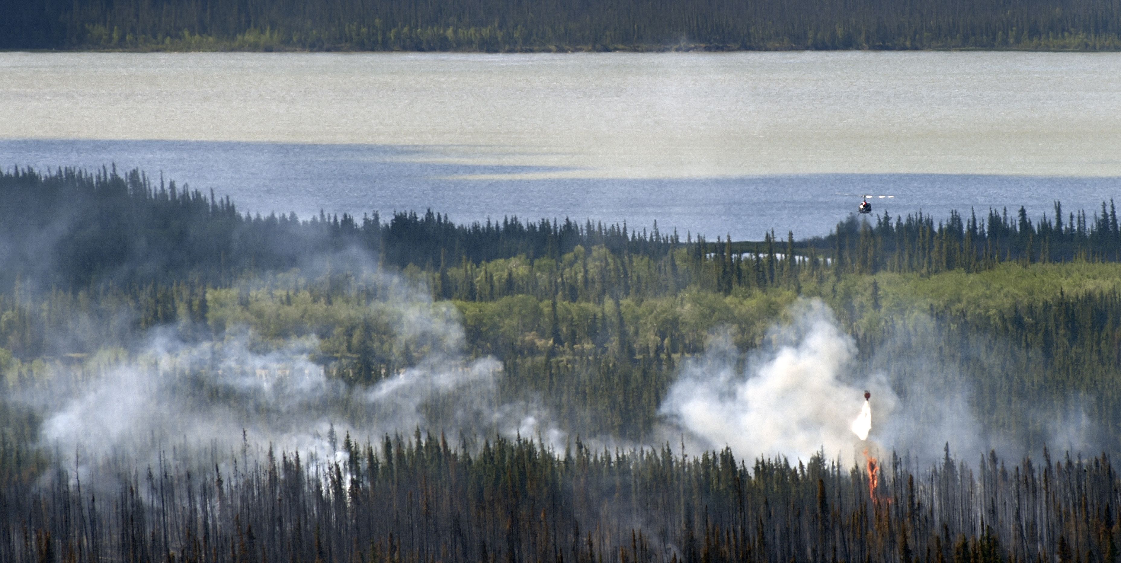 A helicopter equipped with a water dropping bucket douses hotspots on the Tetlin River Fire on Tuesday, June 21, 2016. Photo by Sam Harrel/Alaska Division of Forestry