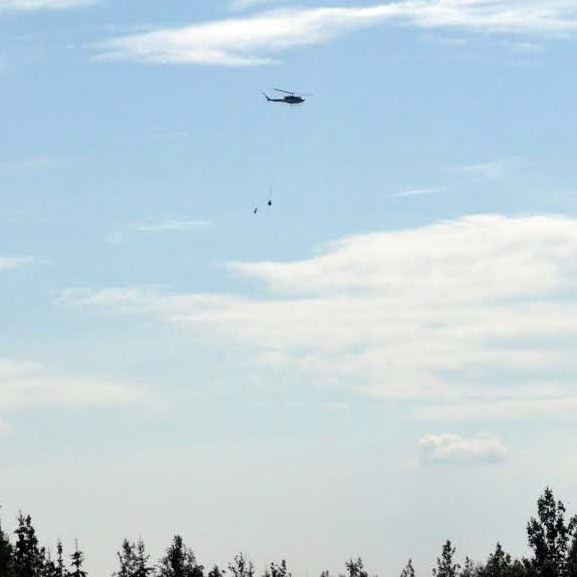 A BLM Alaska Fire Service helicopter carries supplies to firefighters working on fires within the Alatna Complex. Most supplies are delivered via sling loads that are carried in by helicopters. Before the supplies are broken into sling loads they are first delivered to the Allakaket airport, then separated based on where they are to be delivered.