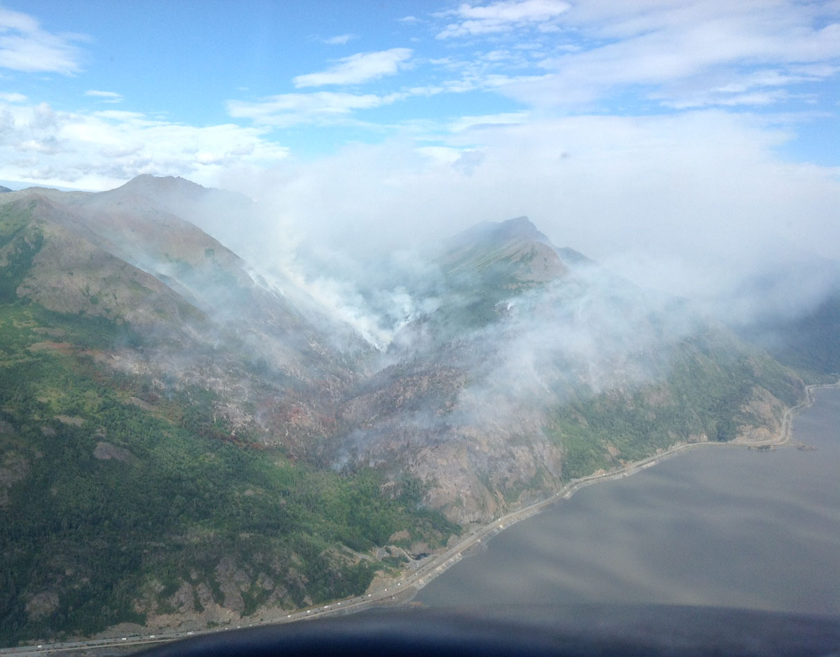 July 19, 7:30 p.m. – The Alaska Division of Forestry continues to battle a wildfire burning just south of Anchorage that is visible from the Seward Highway and snarling traffic on one of Alaska’s most scenic byways.