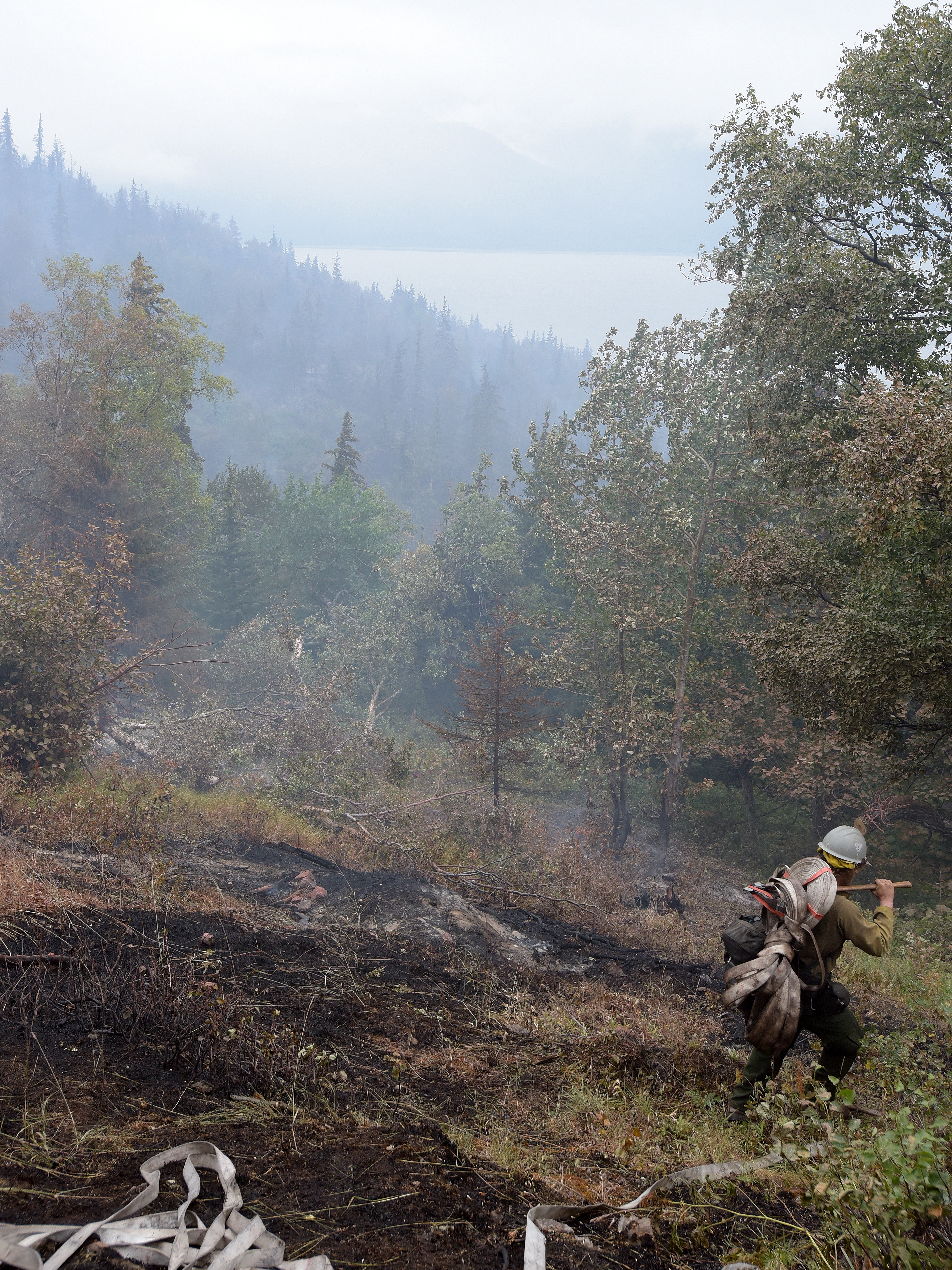 A member of the Pioneer Peak Interagency Hotshot Crew hauls several 50-foot length of hose along the left flank of the McHugh Fire on Thursday, July 21, 2016. The fire, just south of Anchorage, is burning in steep, rocky terrain littered with large downed trees. Sam Harrel/Alaska Division of Forestry