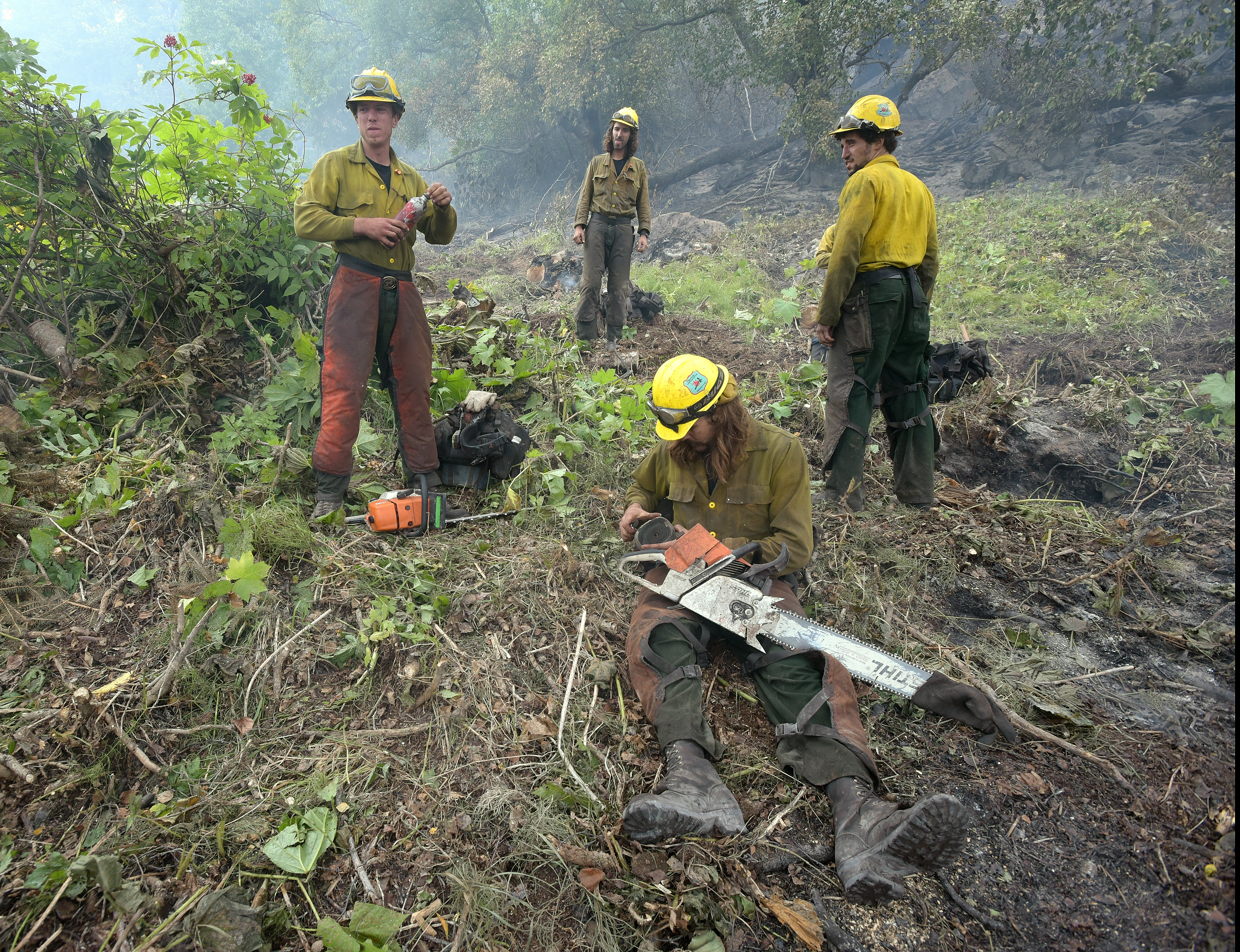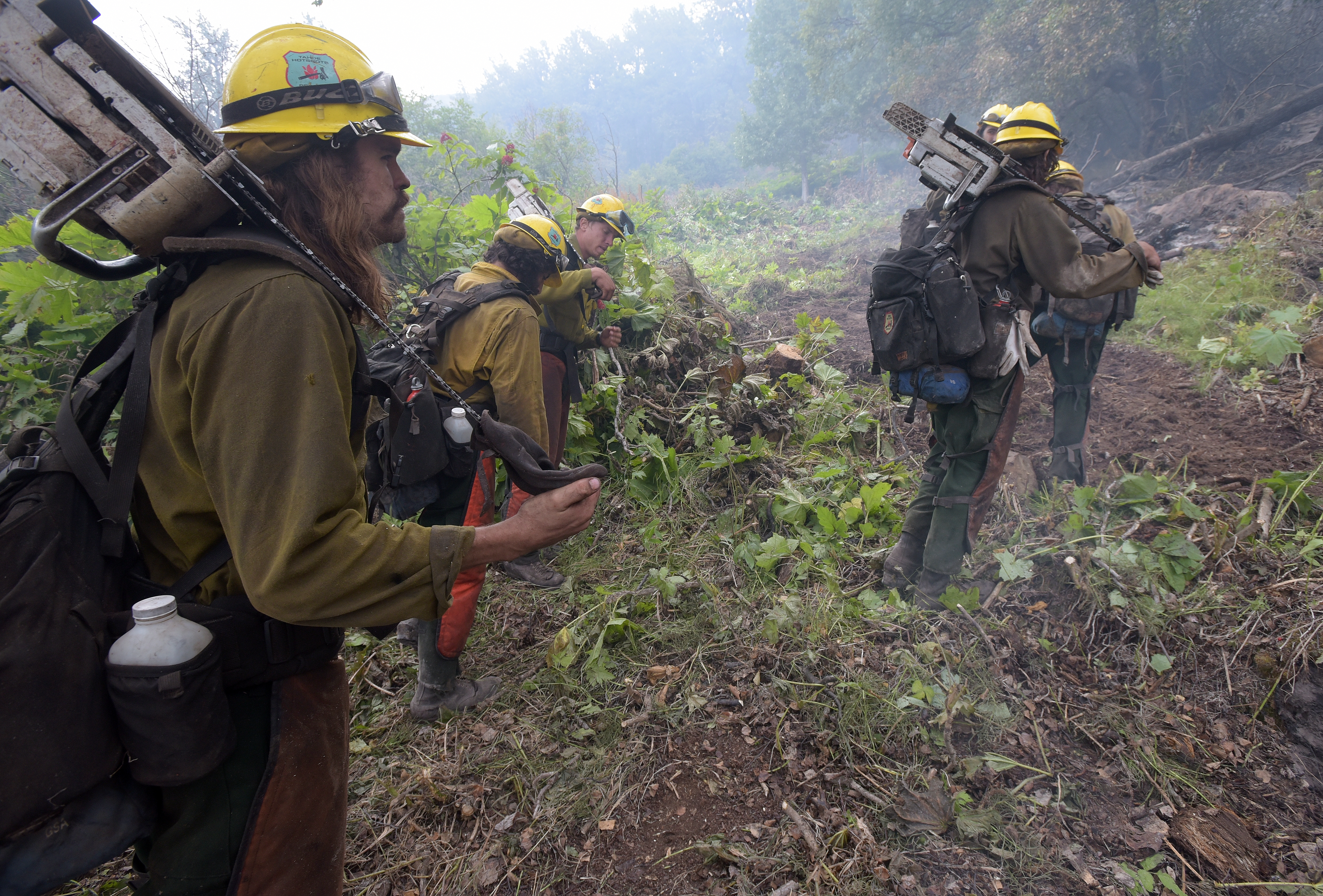 Members of the Tahoe Hotshots prepare to go back to work after a lunch break Thursday, July 21, 2016. They are part of a squad cutting a saw line along the left flank of the McHugh Fire burning just south of Anchorage. The firefighters are working in steep, rocky terrain littered with large downed trees. Sam Harrel/Alaska Division of Forestry