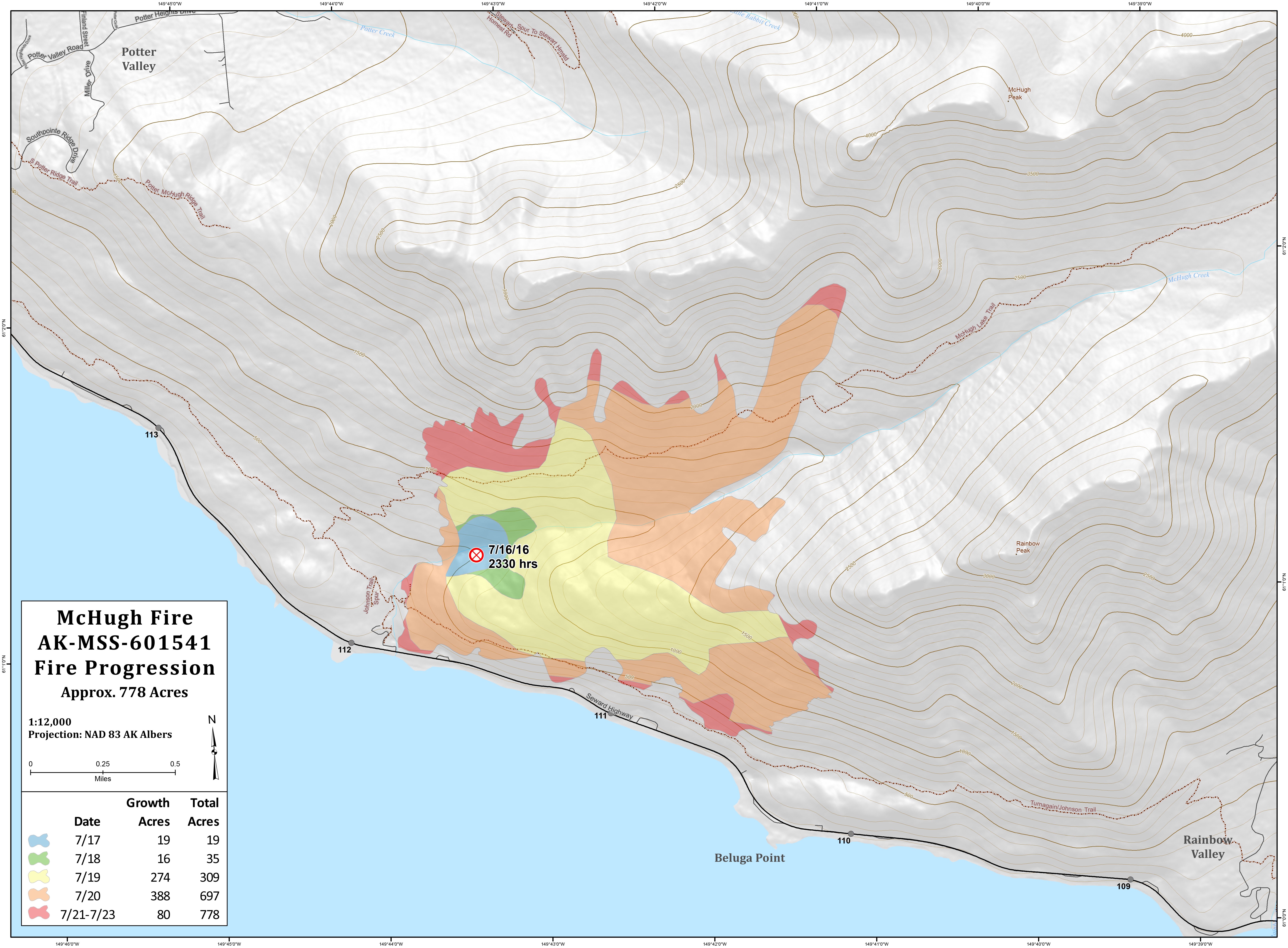 Motorists should continue to use caution when driving the Seward Highway through the fire area. The 35 mph speed limit continues through the affected fire area but has been shortened to mile 110 to 112 (McHugh Creek to Beluga Point), pull offs outside that area are now open. Falling rocks and debris are causing intermittent road closures of the Seward Highway due to heavy rain over the burn-affected area. For updated highway information call 511 the State of Alaska Department of Transportation Traveler Information line.