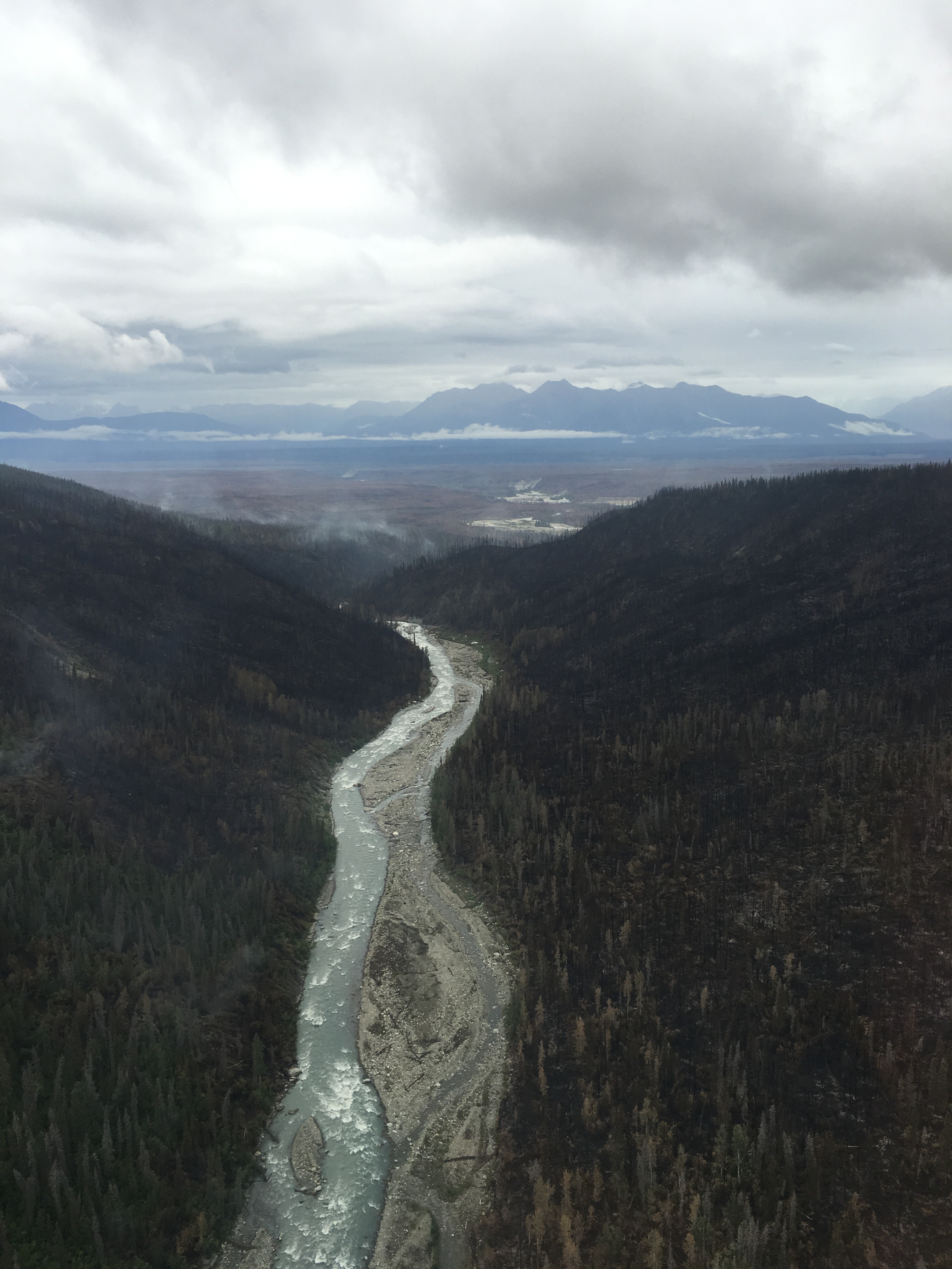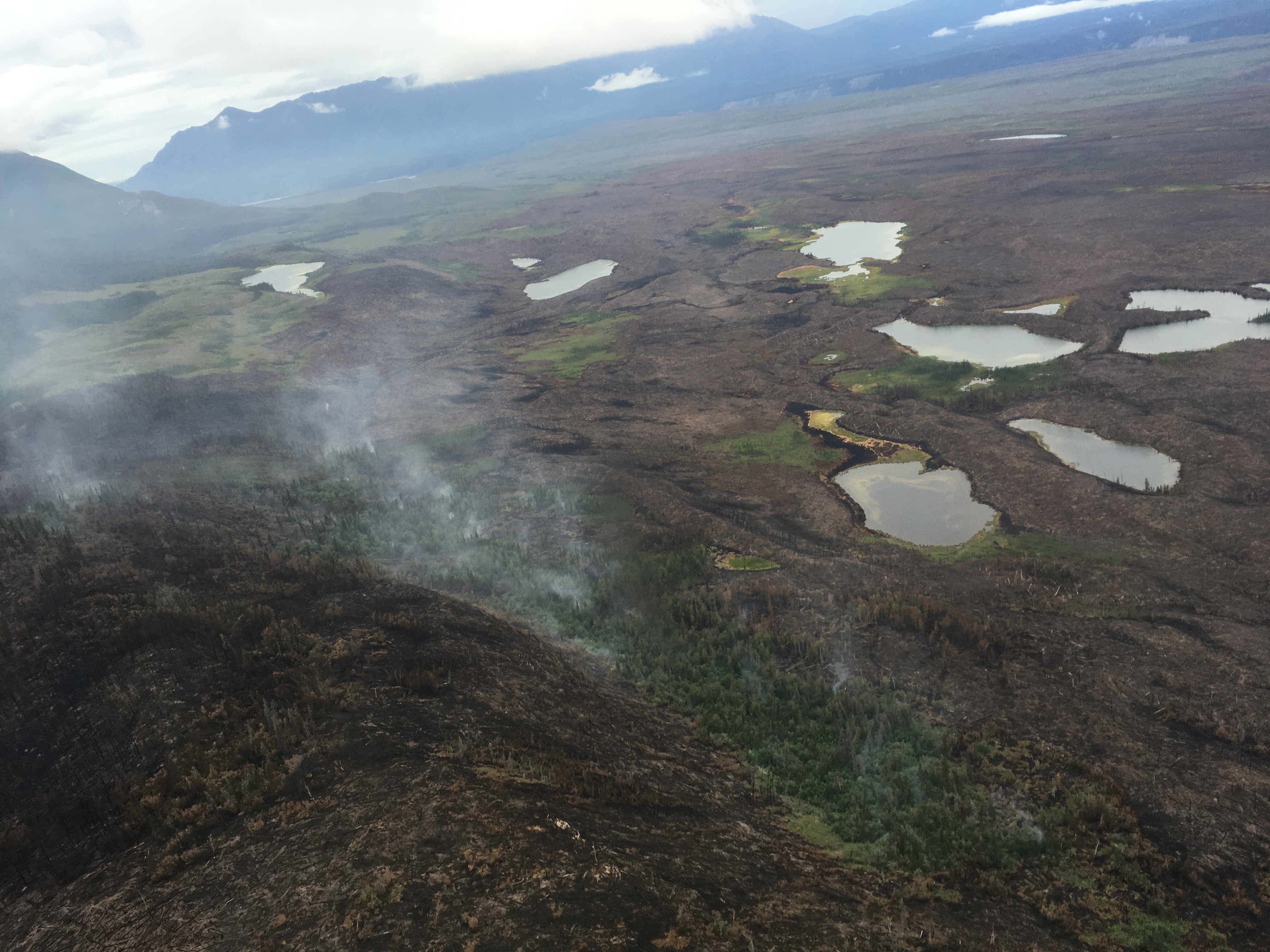 On July 25, 2016 the Steamboat Creek Fire smolders in the Chakina River drainage. Photo credit: Dub Evans, AK Division of Forestry