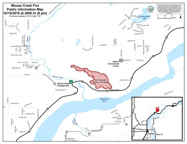 The Moose Creek Fire is burning about 12 miles north of Palmer and 5 miles south of Sutton. The Glenn Highway remains open but motorists passing through the area should slow down and be alert for firefighters and firefighting equipment on the road.