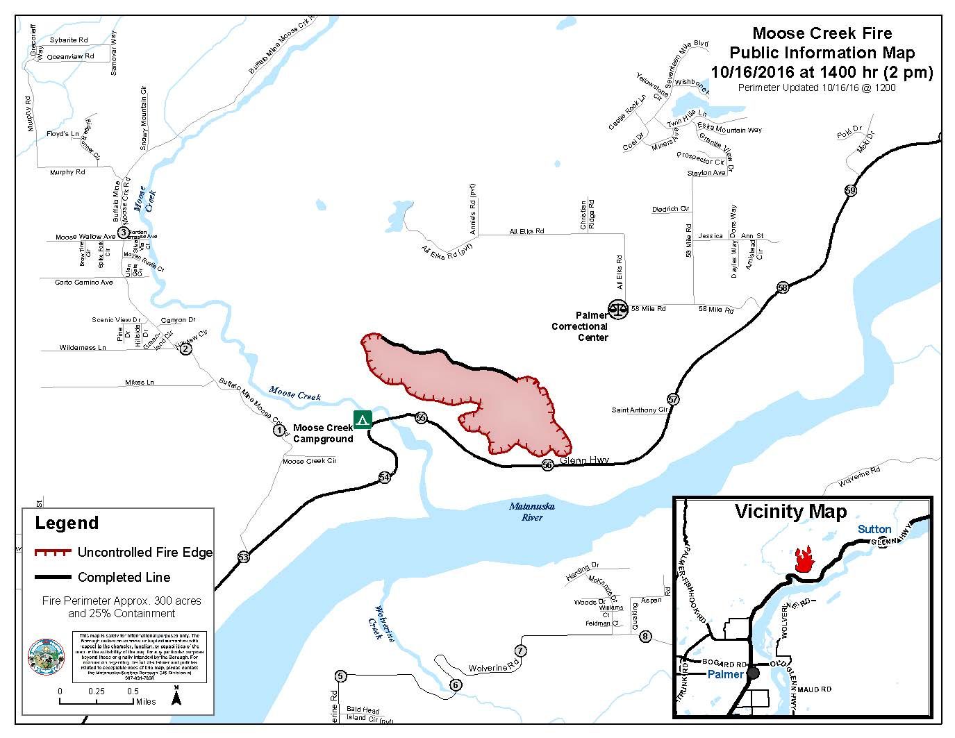 Sunday, Oct. 16 – 4:10 p.m. – A wildfire in the Matanuska Valley near Sutton is now 25 percent contained and firefighters continue to battle the blaze in harsh conditions.