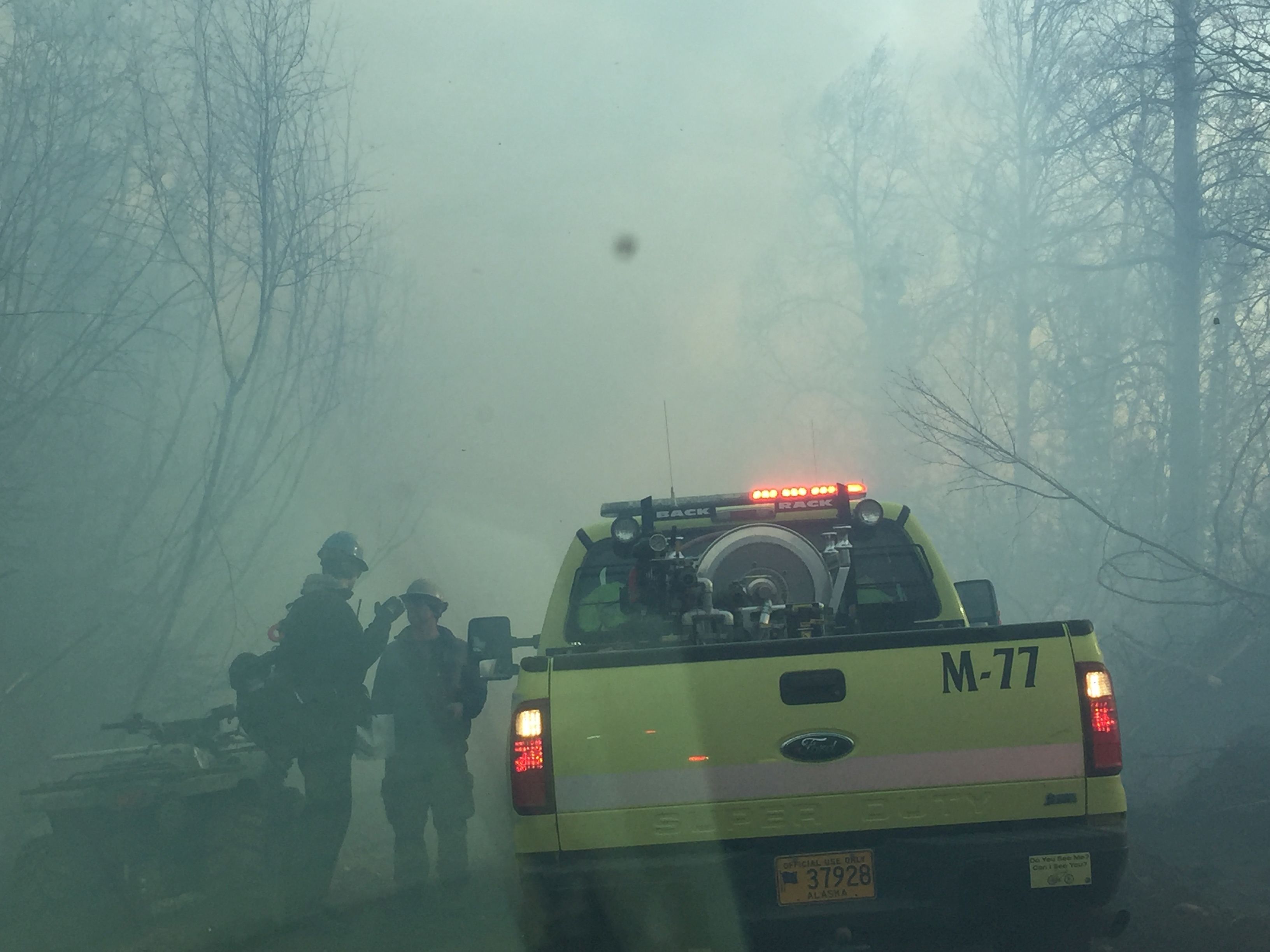 The fire is burning along the Glenn Highway near Mile 56, about 5 miles south of Sutton and 12 miles north of Palmer. The highway remains open, though motorists driving in the area should use caution and keep an eye out for firefighters and firefighting equipment on the road.