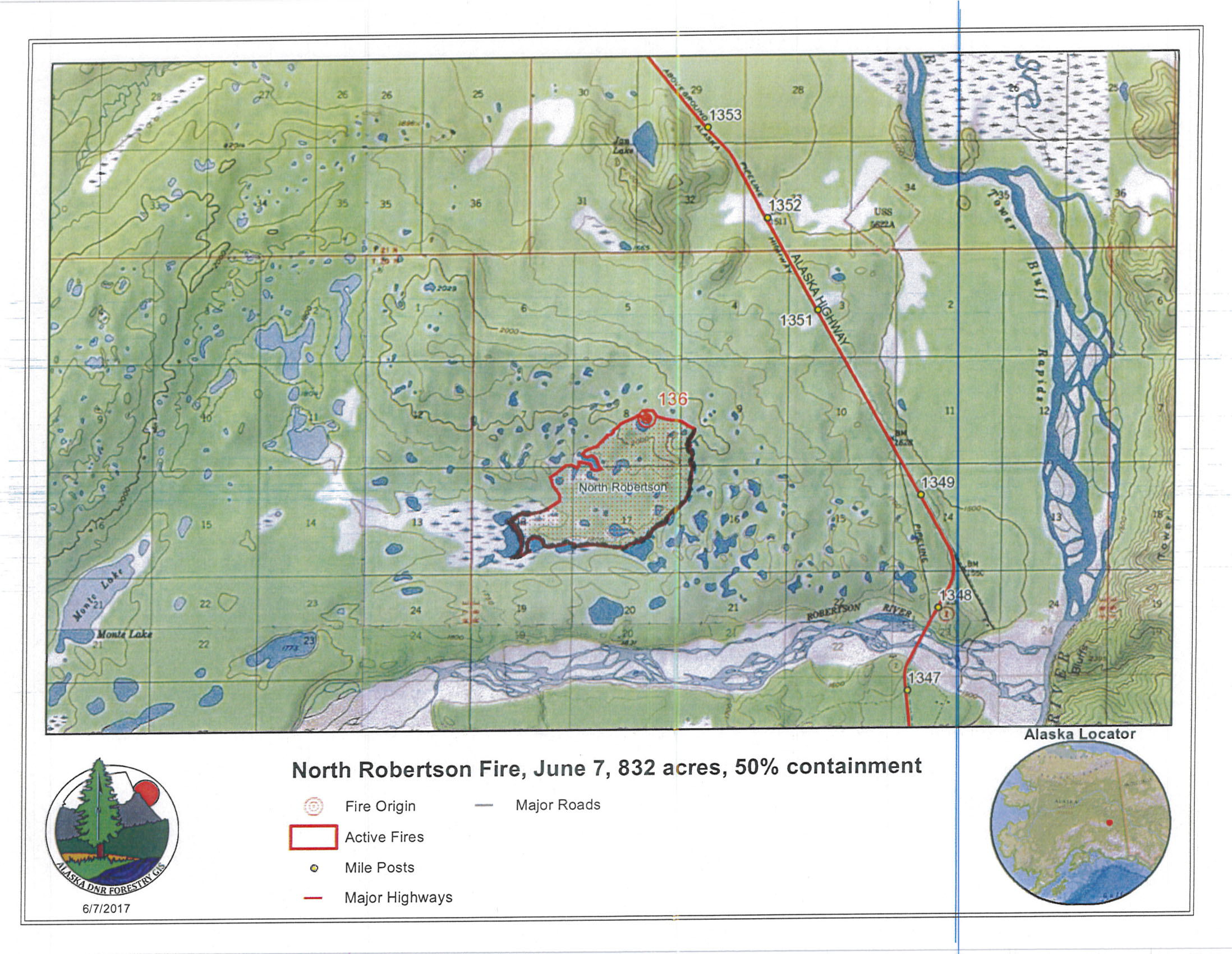 The perimeter map for the 832-acre North Robertson Fire burning 30 miles northwest of Tok. The black line represents containment line.