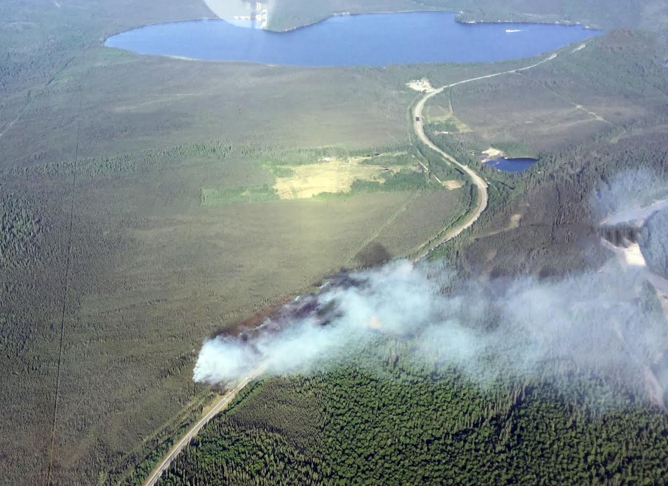 This aerial photo shows how close a wildfire reported Friday night was to the Richardson Highway near Milepost 308.5. The highway was shut down for a short time Friday night due to smoke and safety concerns. Birch Lake is in the background, approximately 3 miles to the south. John Lyons/BLM Alaska Fire Service