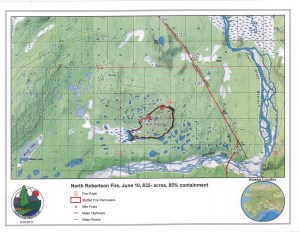 The latest containment map for the North Robertson Fire along the Alaska Highway 30 miles northwest of Tok. The fire is now 85 percent contained, as represented by the black line along the perimeter.