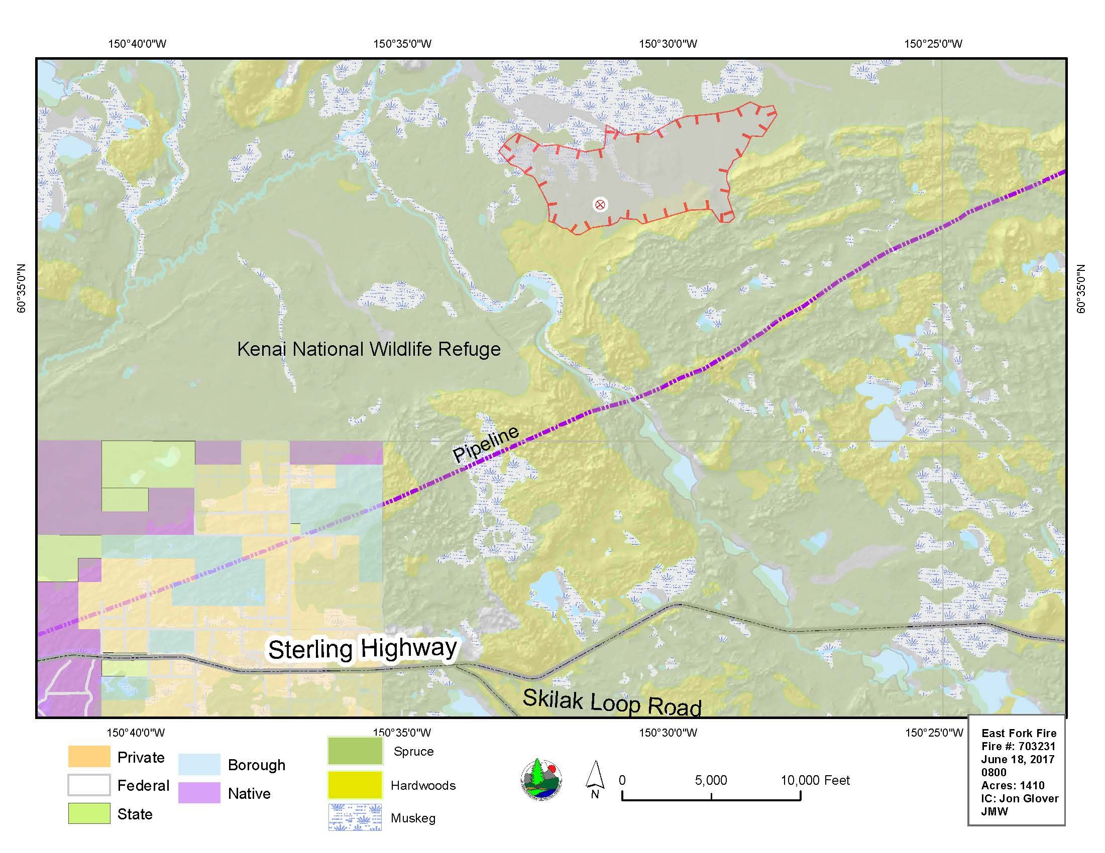 The lightning-caused East Fork has grown to over 1300 acres and continues to burn in a limited protection area of the Kenai National Wildlife Refuge. The fire remains approximately 4.5 miles north of the Sterling Highway and 3.5 miles east of the nearest residential area.