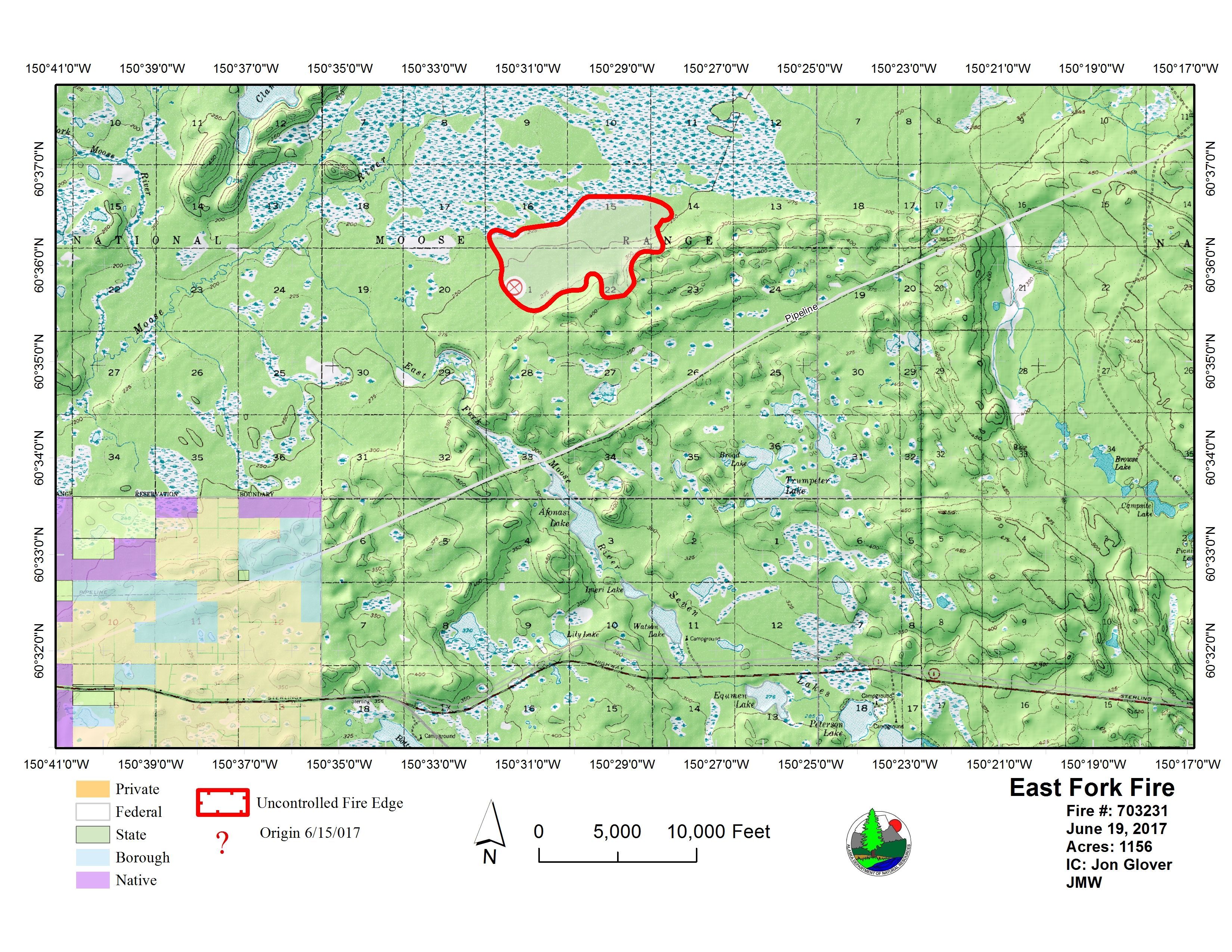 Due to more accurate mapping, the East Fork fire is now estimated to be 1,156 acres. The fire remains approximately 4.5 miles north of the Sterling Highway and 3.5 miles east of the nearest residential area.