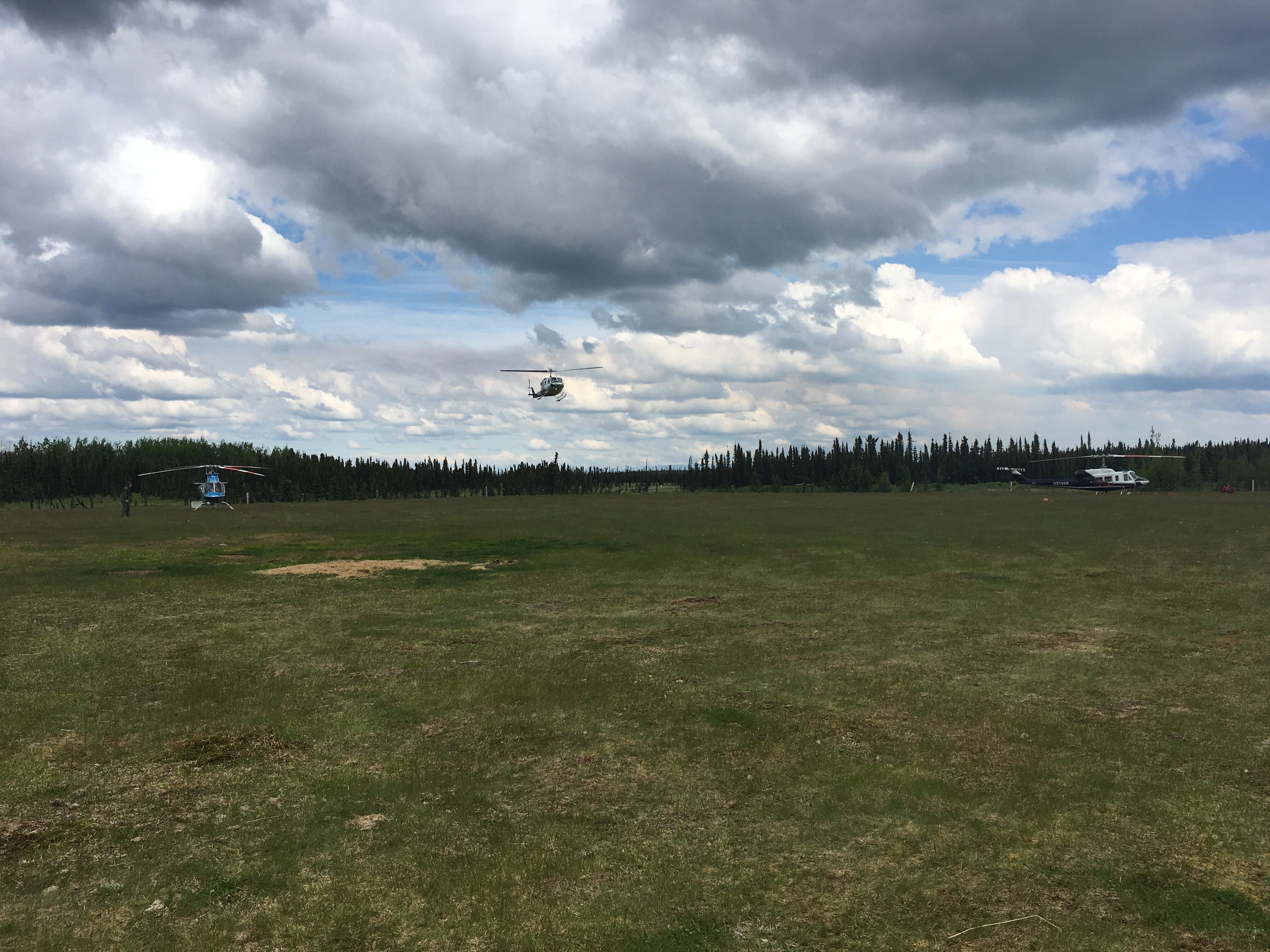 A helicopter landing in between 2 others parked in a field being used as a helibase. Photo by: Celeste Prescott