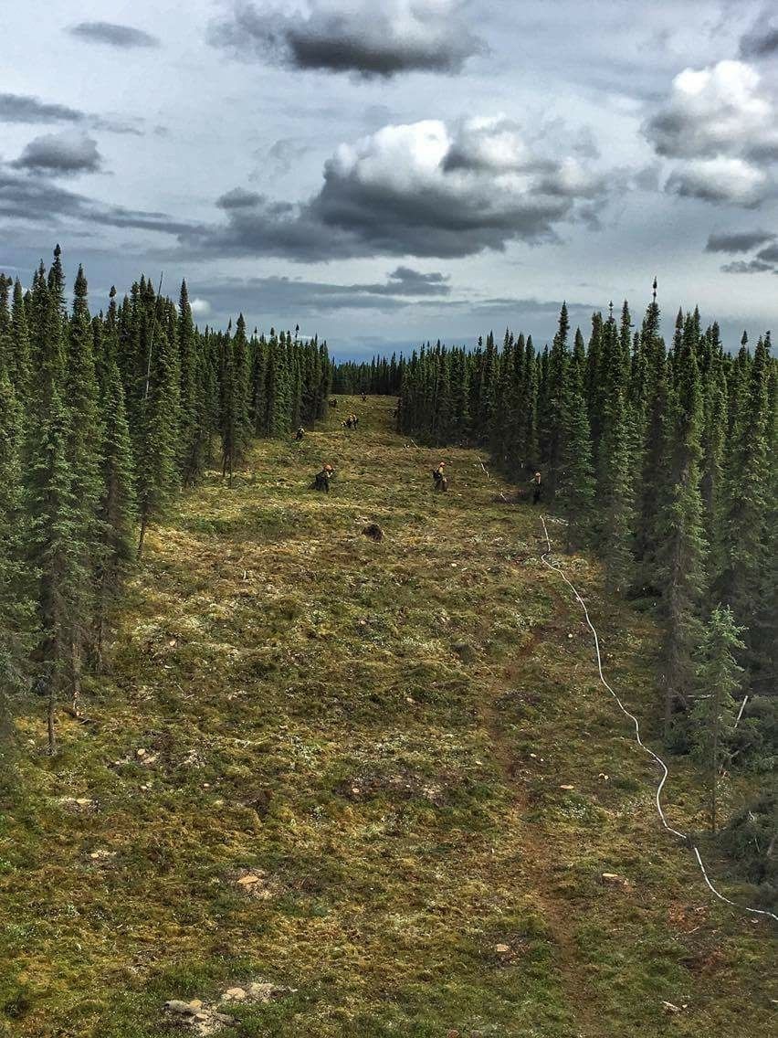 A picture of the North Star crew laying hose along the 30-foot-wide ENSTAR pipeline easement. Photo Credit: Lakota Burwell