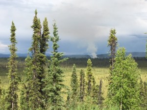 A smoke column from the Gardiner Creek Fire as seen from the Alaska Highway Thursday night. Photo by Scott Eastling.