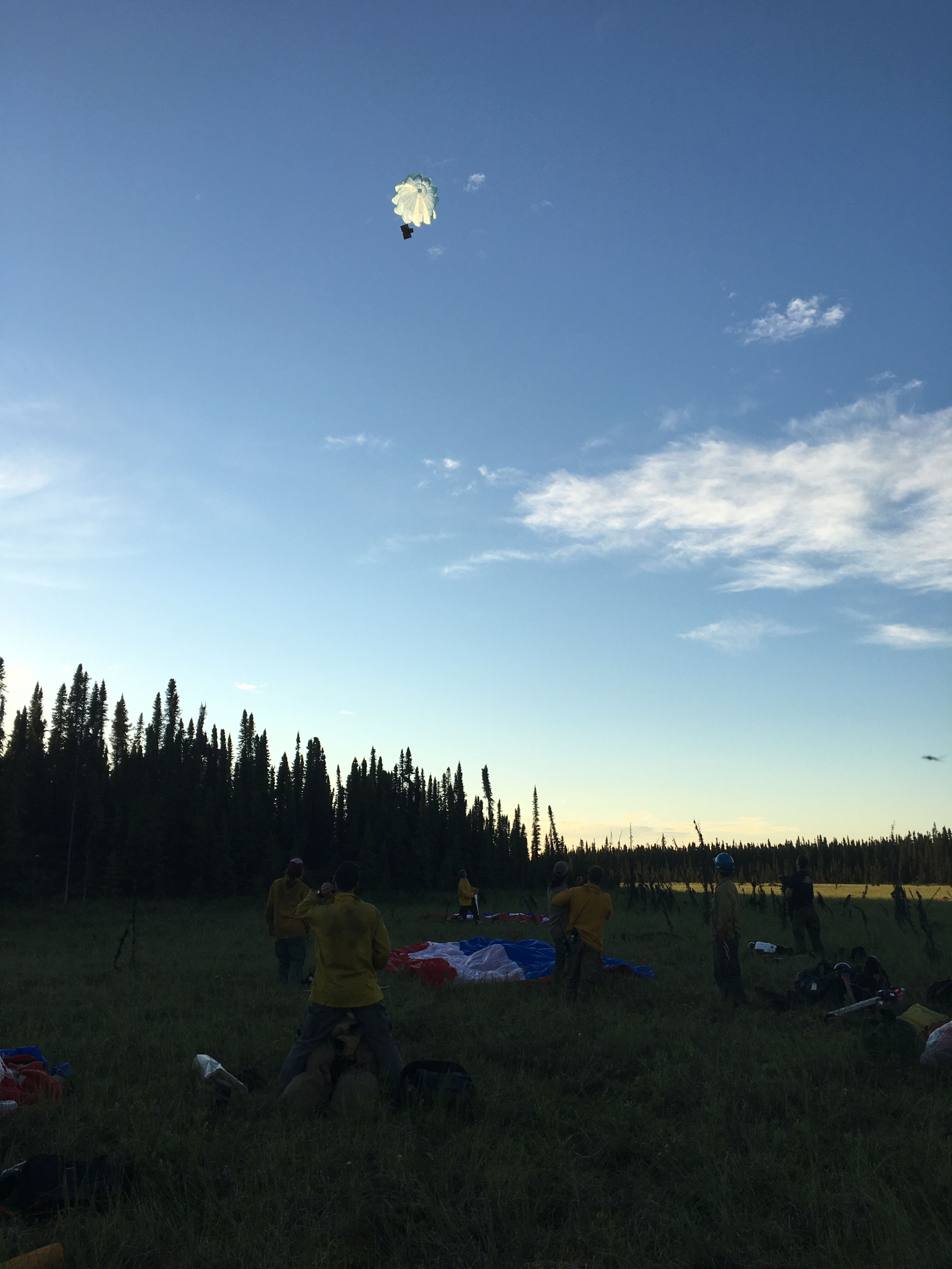 A photo of Smokejumpers on the first day as they pack up their parachutes and receive supplies via paracargo. Photo Credit: Robert Yeager