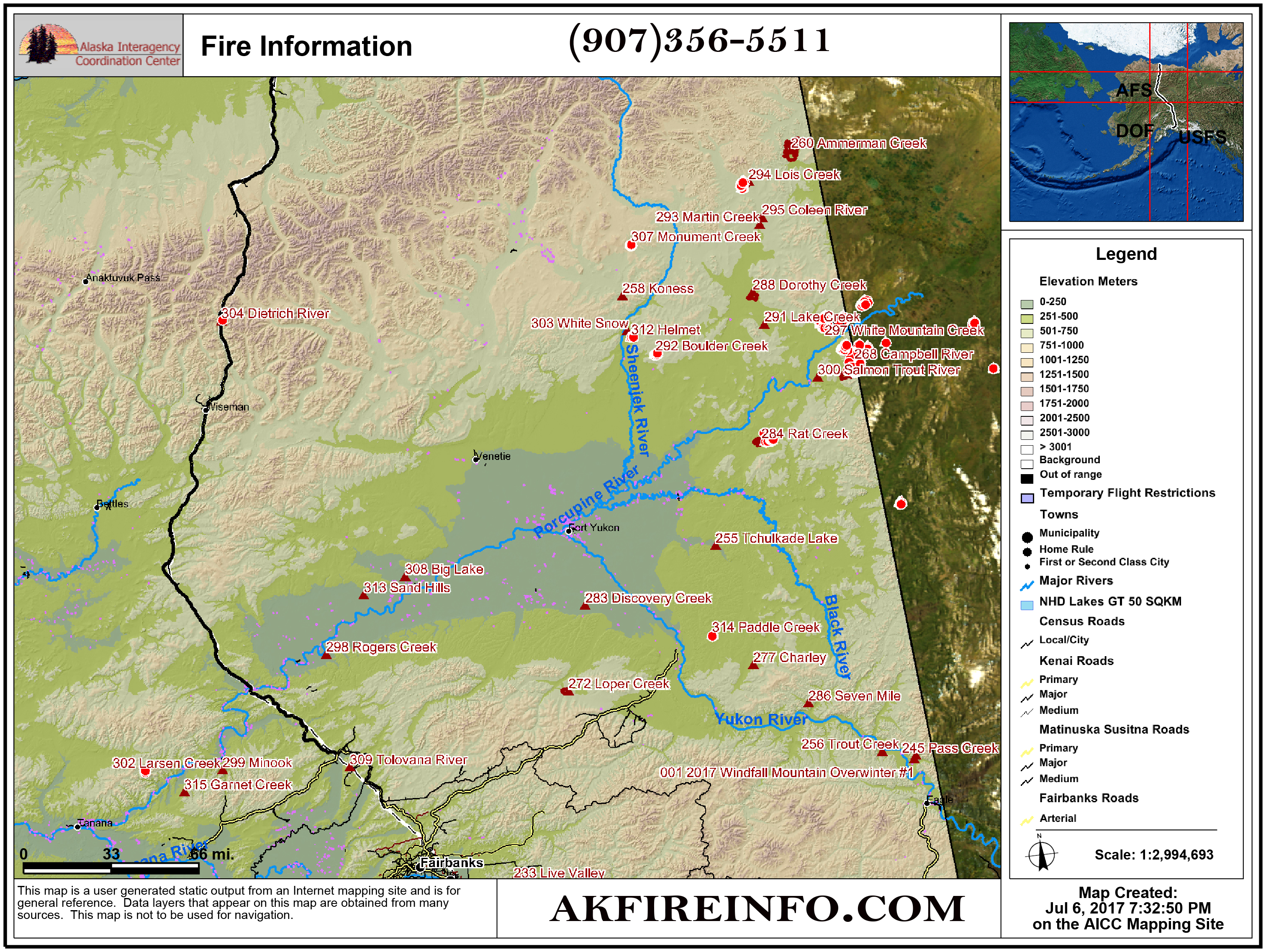 Campbell River (#268) – Estimated total size is more than 60,000 acres with 23,100 on the Alaska side of the border. Start date 6/26/17. 34 personnel assigned including the BLM AFS Midnight Sun Interagency Hotshot Crew. The fire is burning in a limited protection area within the Arctic National Wildlife Refuge. However, about is about 11 miles east of a Native allotment at the confluence of the Salmon Trout and Campbell rivers and about 10 miles east of a Fish and Wildlife Service permitted cabin on the opposite side of the Campbell River. Fire behavior increased with warmer, drier, windier conditions the past few days resulting substantial growth. Personnel completed fire line at the allotment Wednesday and will continue improving structure protection.