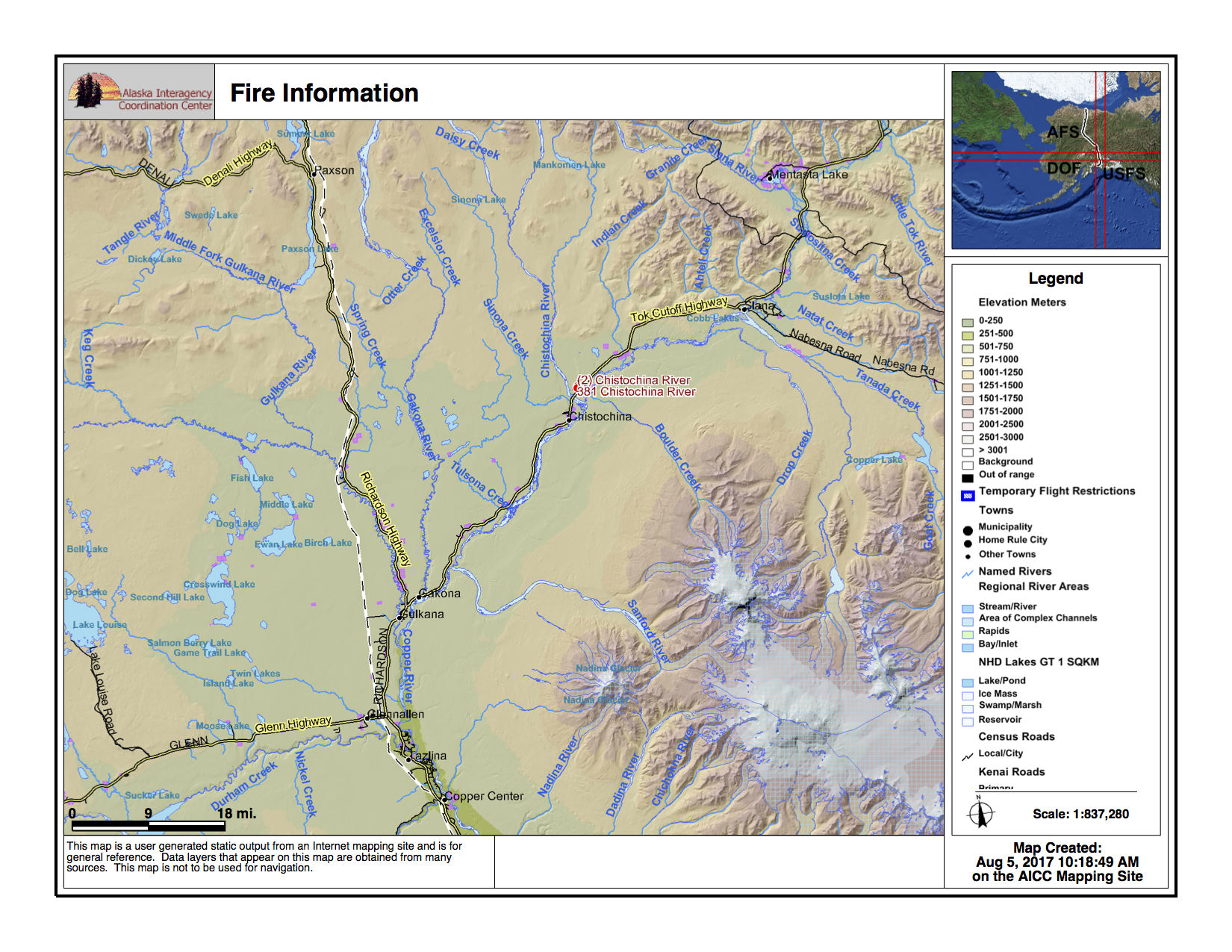 The Chistochina River Fire is burning near Mile 36.5 Tok Cutoff. It was estimated to be 98 acres. Click on this link for a pdf version of the map 8-5-17 381 Chistochina River Fire