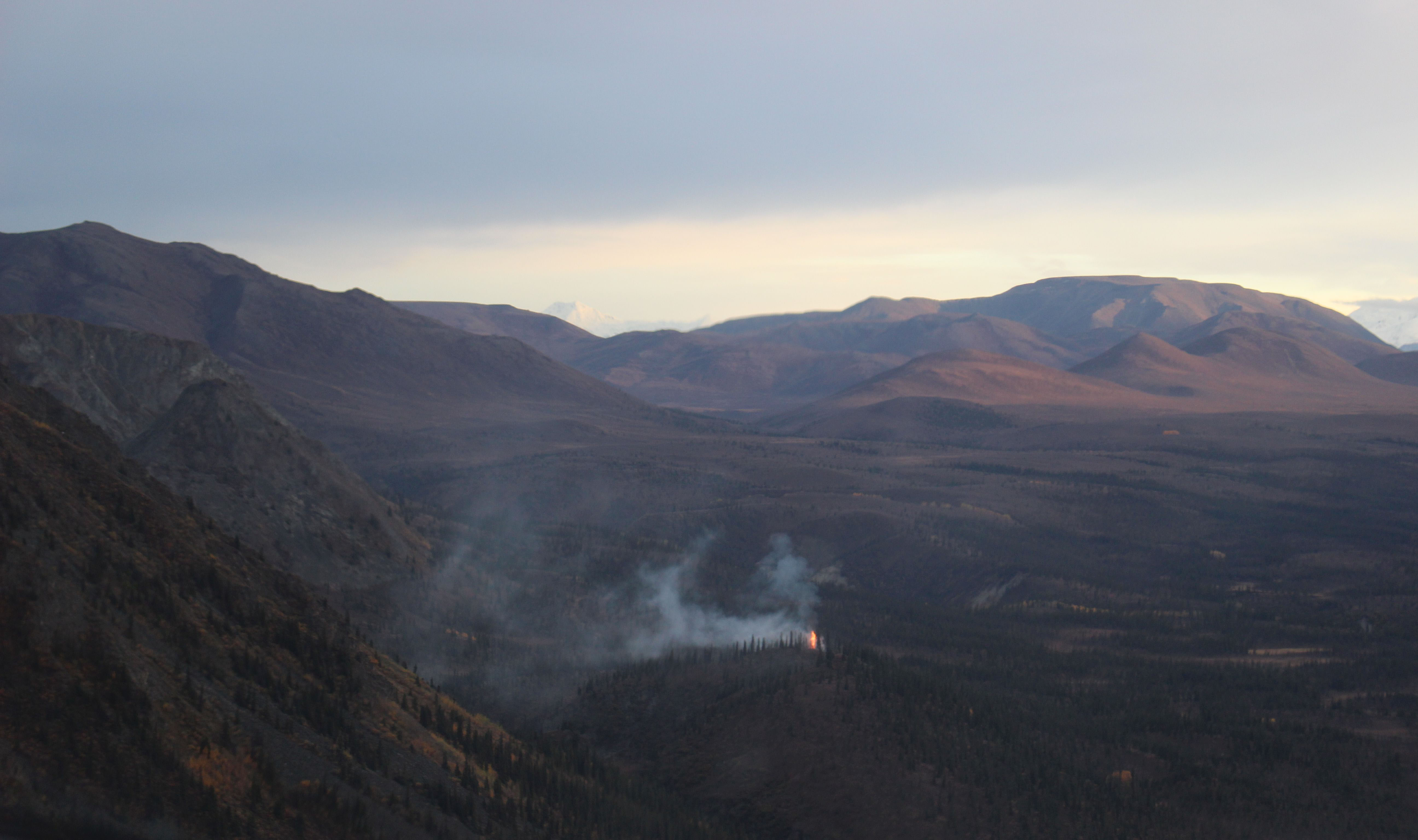 A photo of the Red Hill Fire on Saturday evening. The fire, estimated at 1 acre, is approximately 100 miles northeast of Glennallen and 1.8 miles northeast of Chisana. Luke Wassick/National Park Service