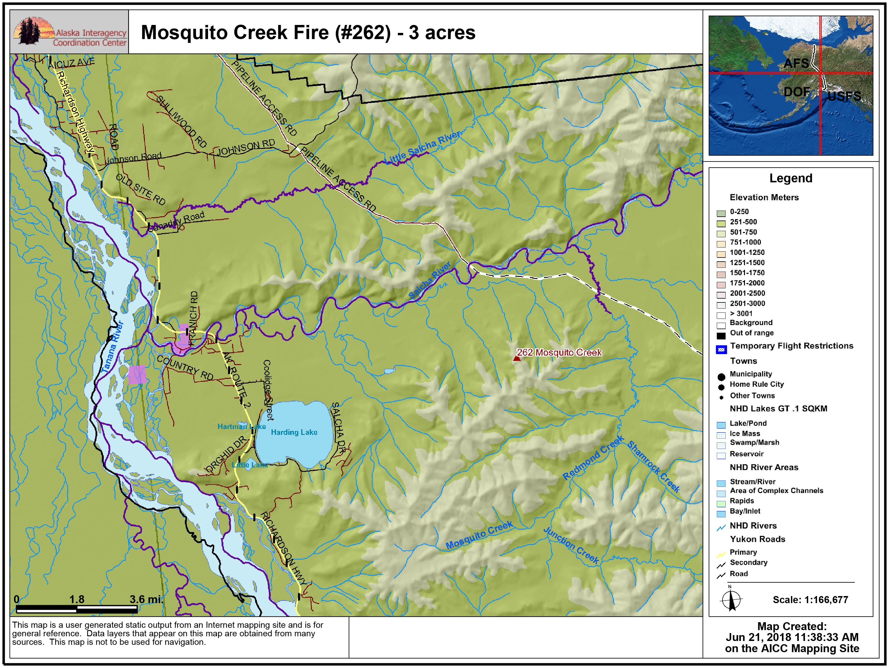 An Alaska Division of Forestry engine crew patrolling near Harding Lake reported the Mosquito Creek Fire (#262) at 6 p.m. after spotting smoke in the area.