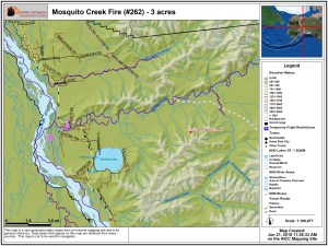 A map showing the location of the Mosquito Creek Fire (#262) approximately 6 miles northeast of Harding Lake.