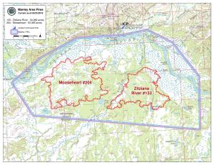 The Zitziana River Fire remains at an estimated 34,380 acres and the Mooseheart Fire is an estimated 53,365 acres. The two lightning-caused wildfires are approximately 100 miles west of Fairbanks and 8 miles south of Manley Hot Springs. There are 122 personnel assigned to the fire.