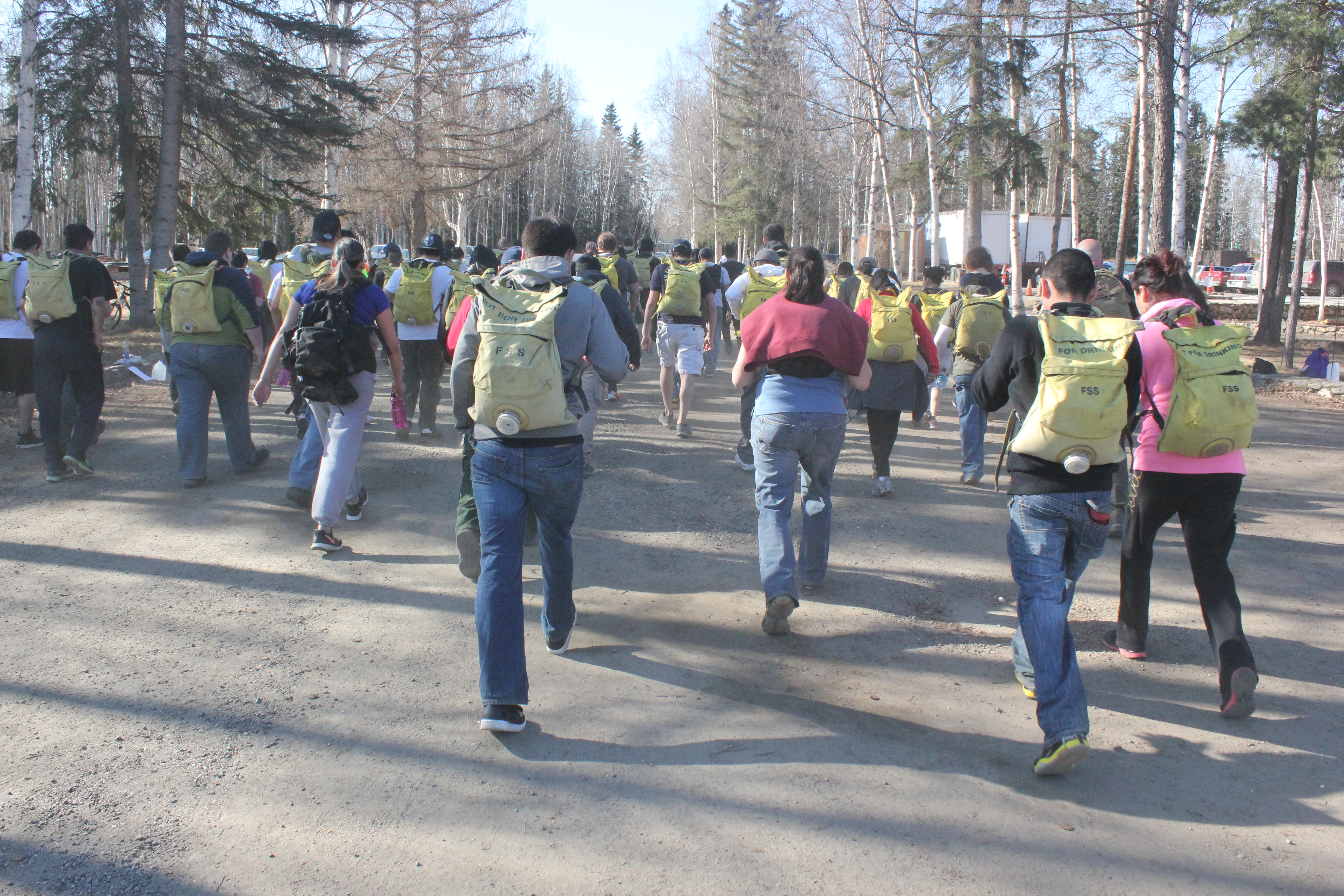 Participants take a Work Capacity (Pack) Test at the Division of Forestry’s Fairbanks Area office. Firefighters must complete a 3-mile walk in 45 minutes or less carrying a 45-pound pack to qualify as an emergency firefighter.