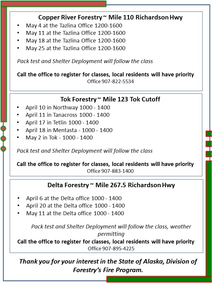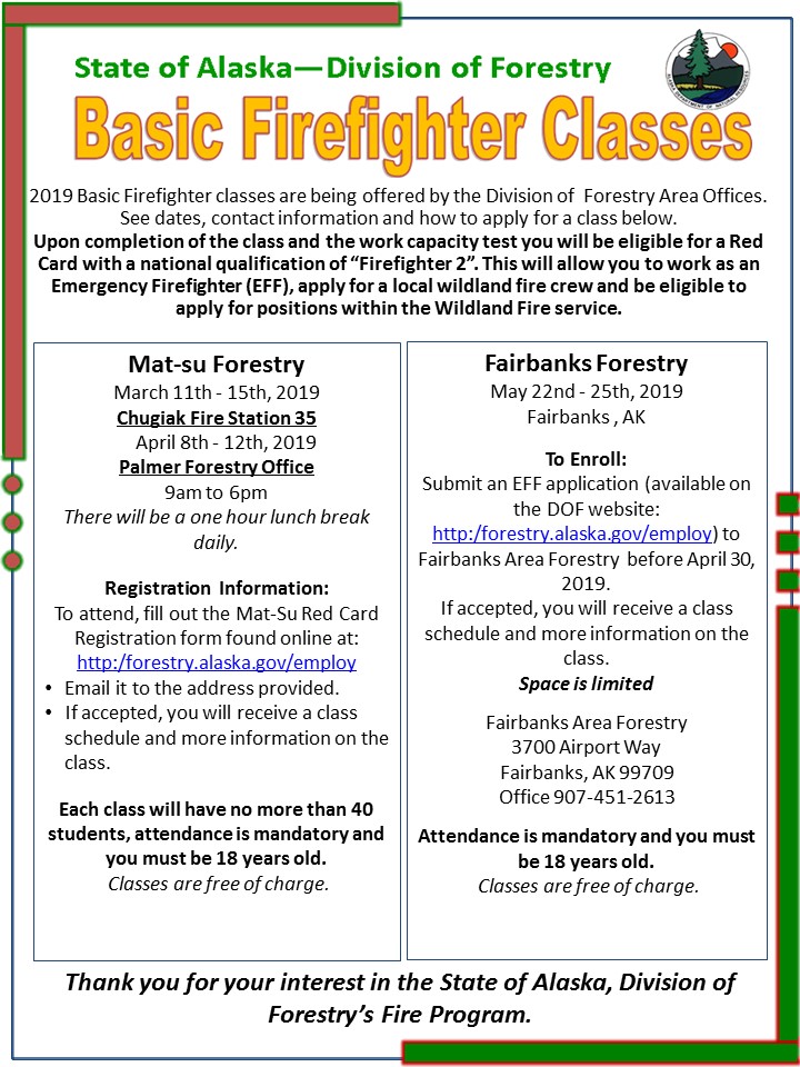 The classes are for veteran firefighters who already have a Red Card, as well as rookie firefighters looking to begin a career in wildland firefighting. Classes are scheduled at Area Forestry offices in and around the communities of Copper Center, Delta Junction, Fairbanks, Palmer, Soldotna and Tok (see attached flyers for schedule of classes).