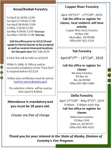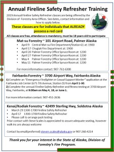 The Alaska Division of Forestry will be holding wildland firefighting training classes at different locations around the state in April and May.